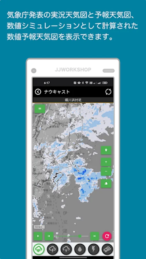 The nowcast card can display cloud movements and thunder/tornado forecasts at your current location as animated images obtained from the Japan Meteorological Agency website.
