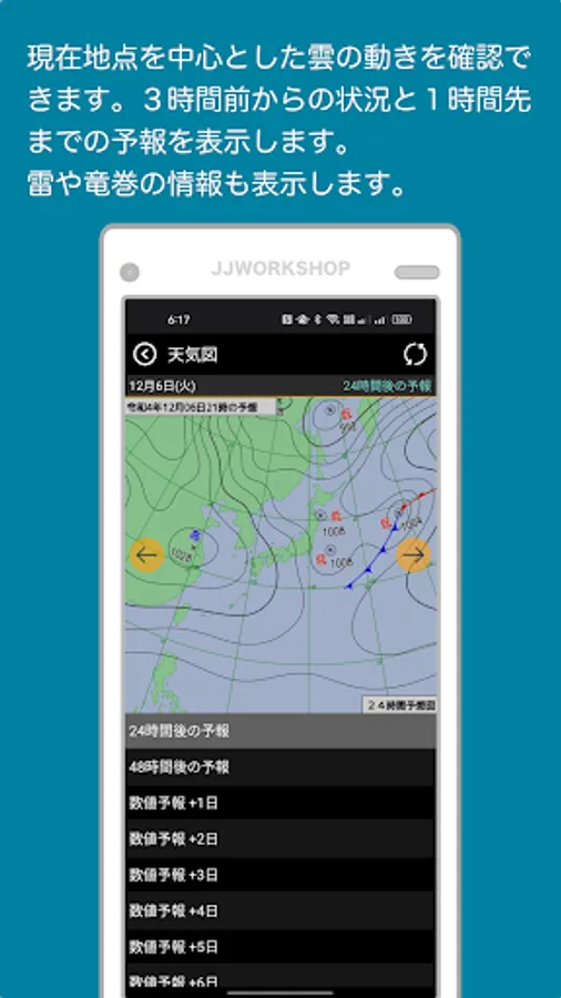 The weather chart card is obtained from the Japan Meteorological Agency site, and shows the current weather chart from 3:00 a.m. on the previous day every 3 hours, the forecast weather chart for 24 hours and 48 hours later, and the numerical forecast for 10 days. You can view the diagram.