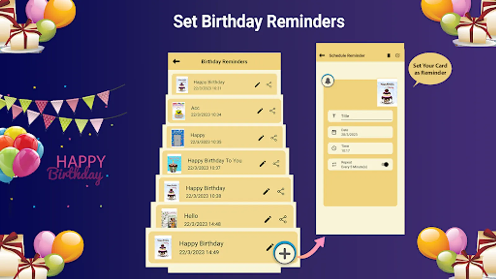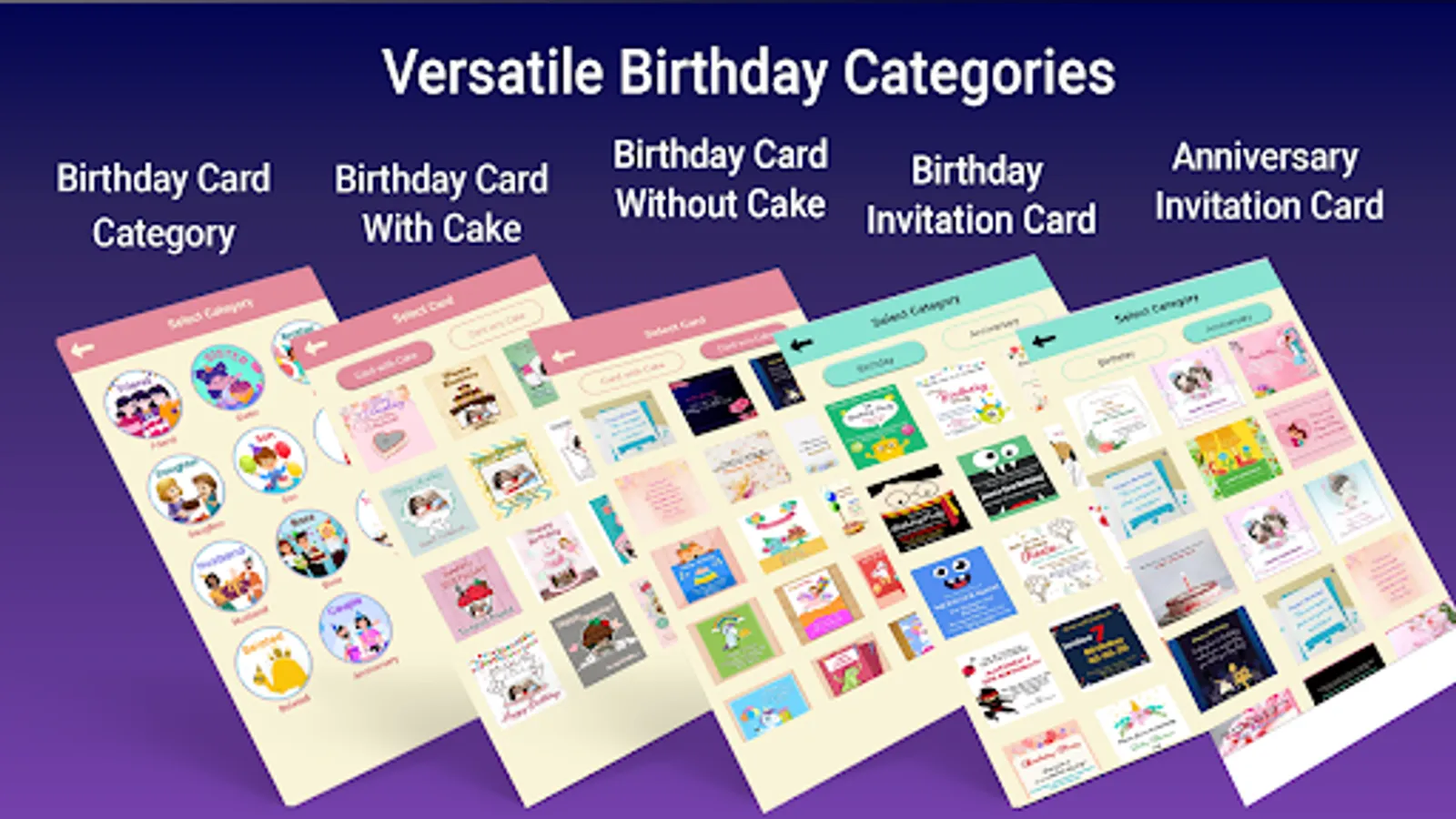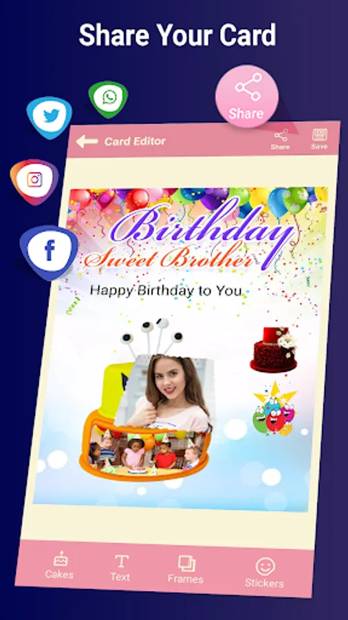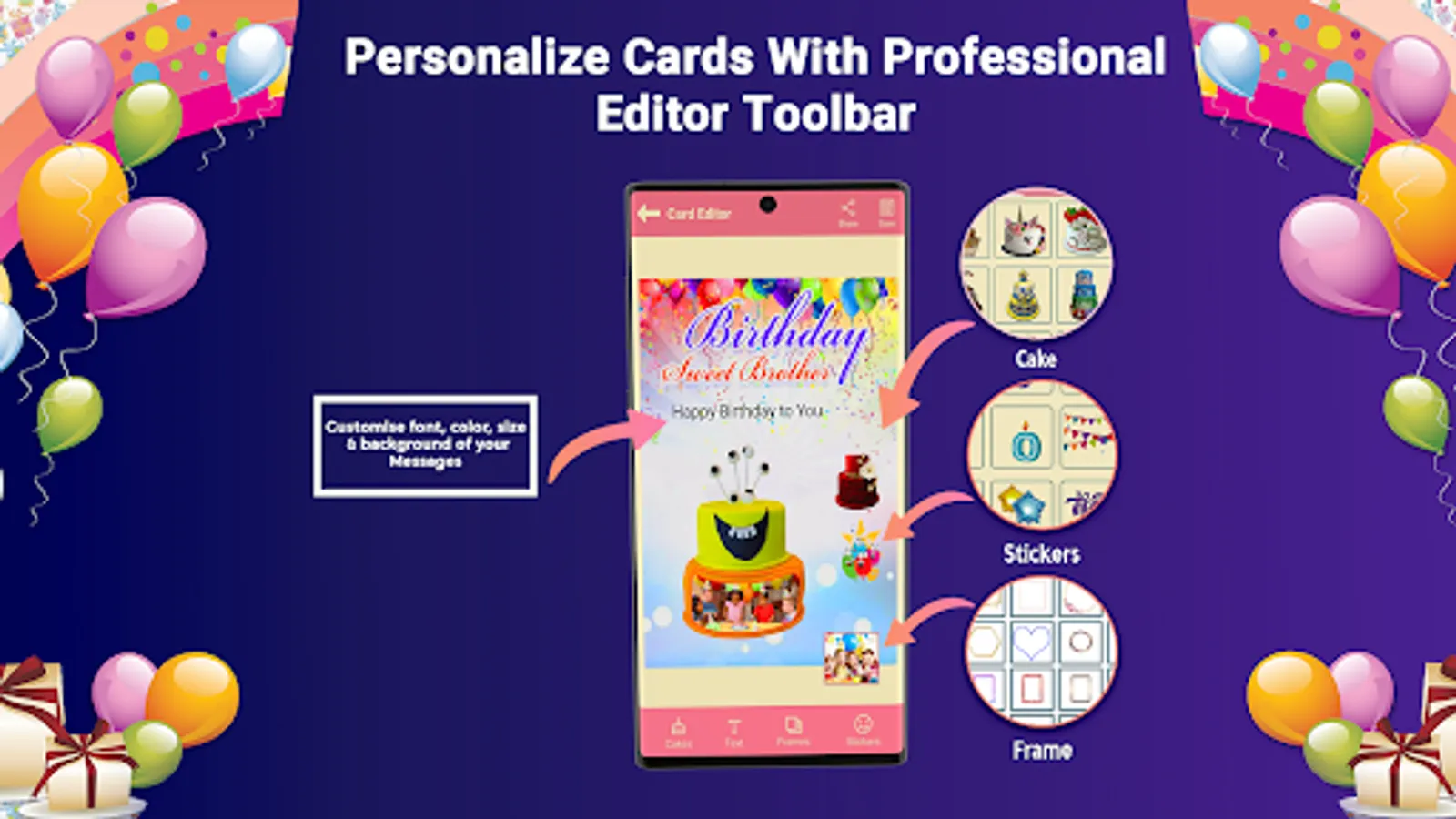 Improve the quality of creation using editor tools with AI technology to enhance cards & frame with better color and contrast. Use overlays, apply blur, text, crop, rotate birthday frames for photo editing, happy stickers like balloons, cakes, stars, heart, gifts countdown and. Last but no least you can also take pic for gallery and edit it. Share your creation with your family, friends and save card in Album so that you can send as you get reminder.