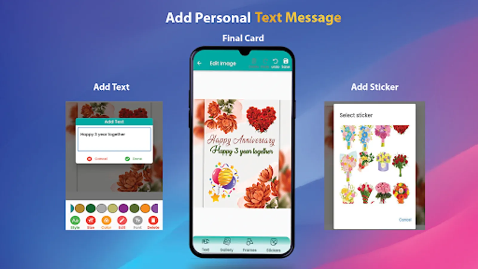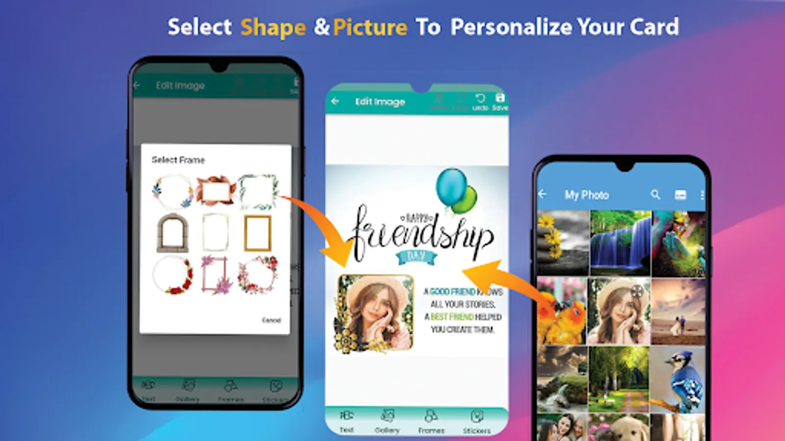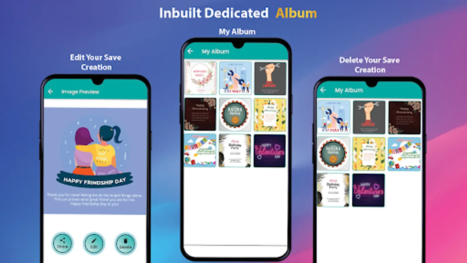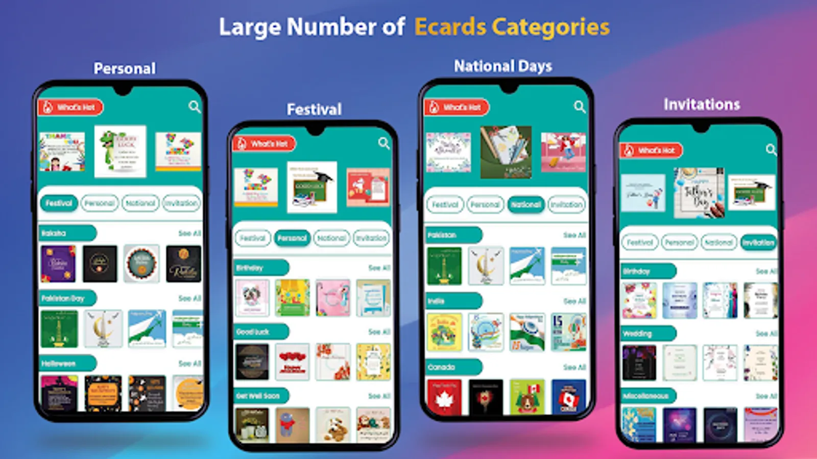 Our app provides a user-friendly GUI which you can use to easily modify your greeting card with built in editing tools that include adding pictures and photos from gallery using photo editing tools. You may also create a card by adding stickers, frames and text and decorate them with your own choice. You can save your personalized e-card in album and share it anytime. Our greeting card creator app not only eases the user to see the recently added cards in Whats new category but also facilitates it to visualize the era’s trending cards in Whats hot category.