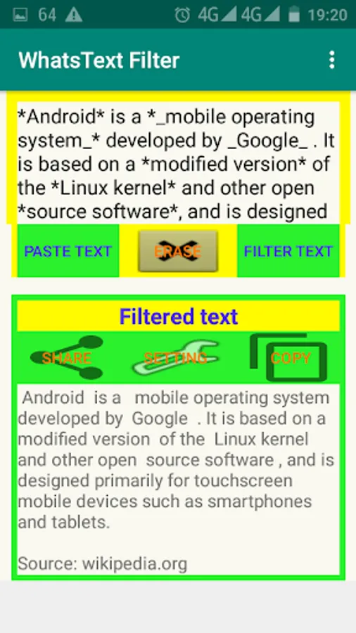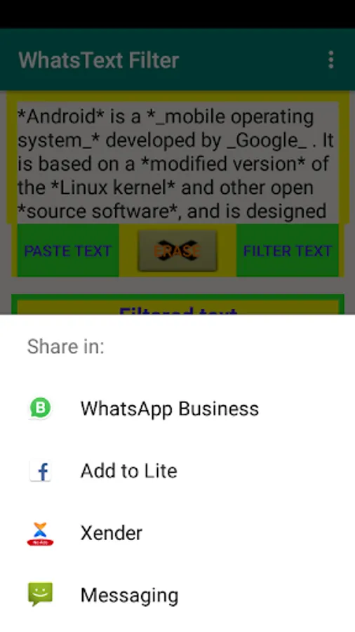 This application allows you to filter in a click the texts from whatsapp containing special characters like Star (*), Tilde (~), and the underscore (_), without wasting time to delete these characters yourself (this which takes time if the text is long) in order to quickly share a filtered text on several platforms like Facebook, Twitter etc ... Or send it in a Word document and other applications.