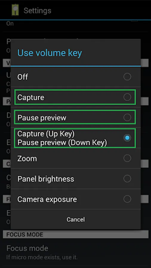 7. [Volume Key] : Use volume-down key to pause/resume preview. (freeze image) Use volume-up key to do camera capture. You can change other option in the camera settings page.