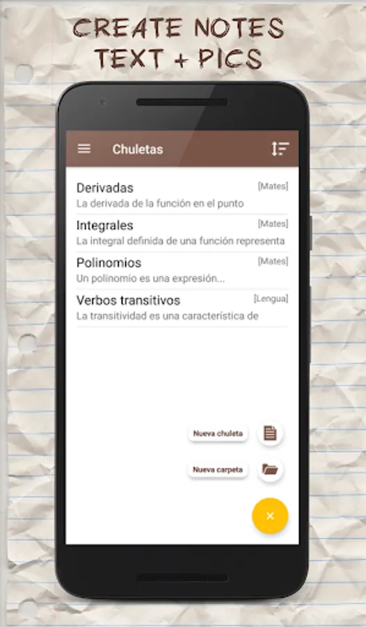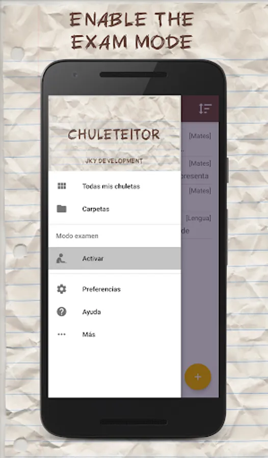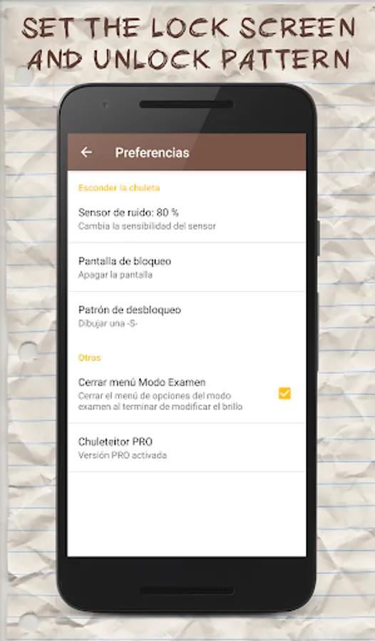 You can get Chuleteitor Pro with a purchase integrated in the application. The Pro version will remove advertising, allow you to change the unlock pattern, turn off the screen in exam mode, and add up to 21 photos per note.