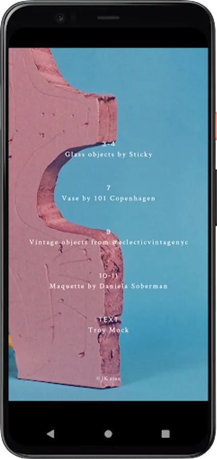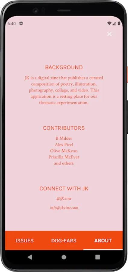 JK Zine is a digital periodical that publishes work from emerging artists in an experimental layout.