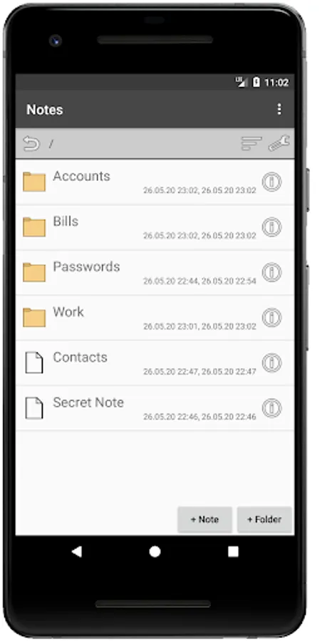 With this app, secret notes can be saved. These can be protected with a password. The notes can be grouped in different folders.