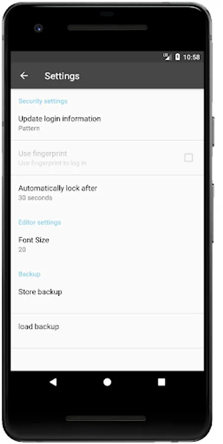 - Timeout: after an expired time the app must be unlocked again (adjustable)