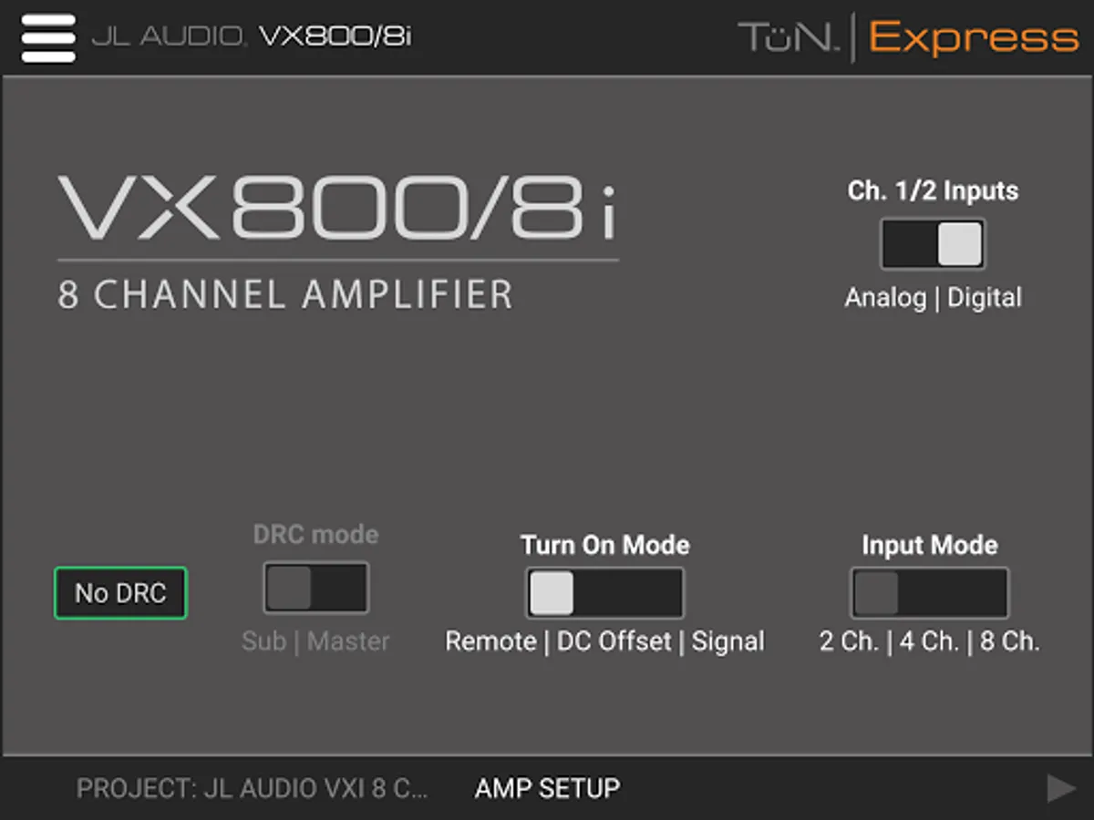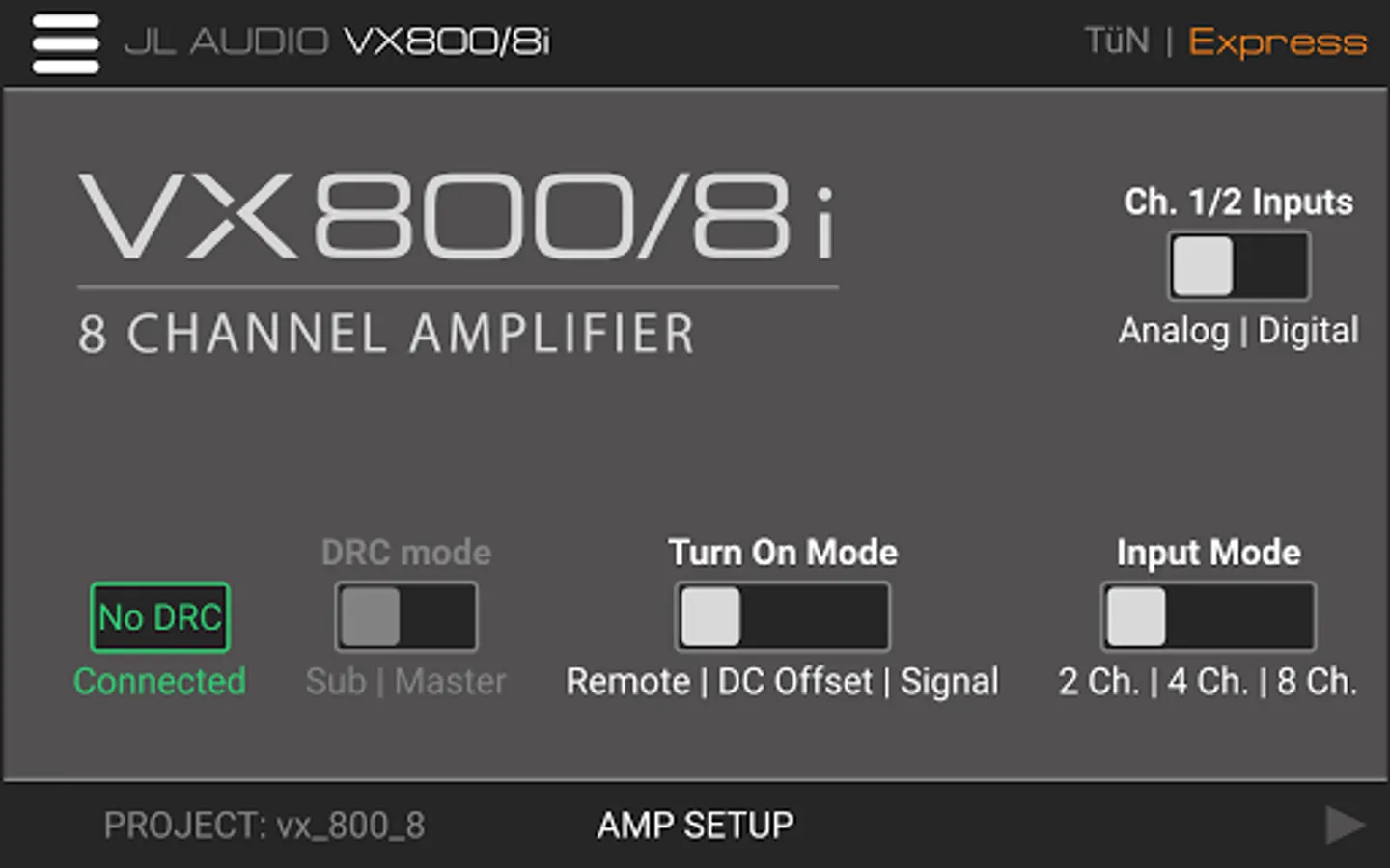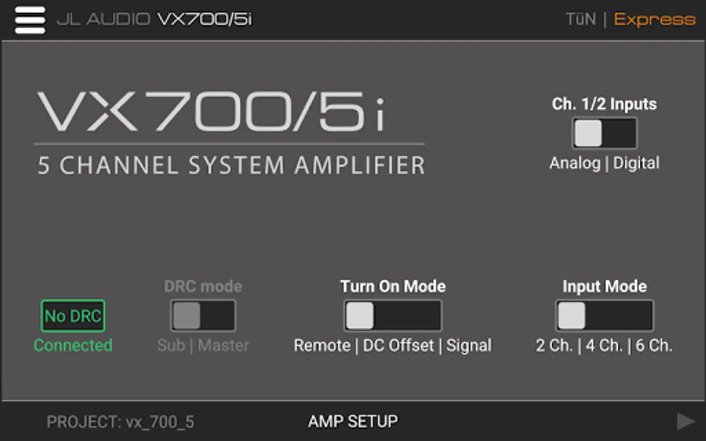 TüN™ Express 3.1 is compatible with JL Audio VXi and MVi amplifiers. It is not compatible with FiX™ or TwK™ processors.
