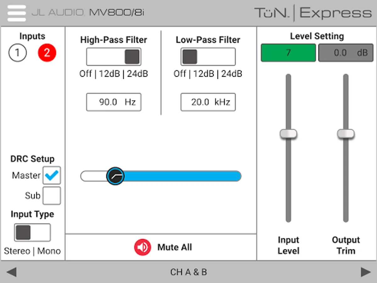Use your Android smartphone to set up and command a streamlined, basic DSP feature set on a compatible JL Audio DSP-based amplifier, via Bluetooth LE connection. TüN™ Express automatically recognizes a compatible JL Audio product and offers a clear user interface optimized for that specific product. A simulation mode is included to simulate any product or perform offline setup.
