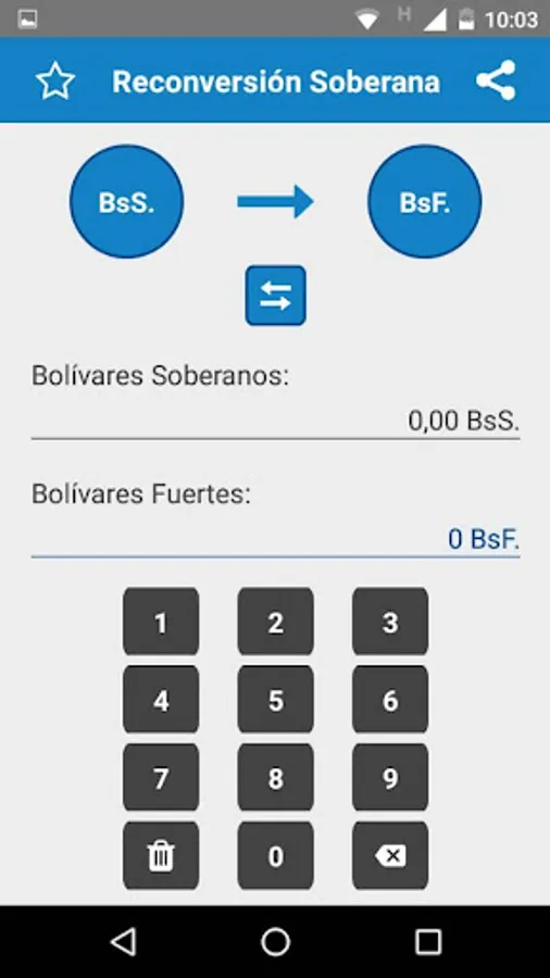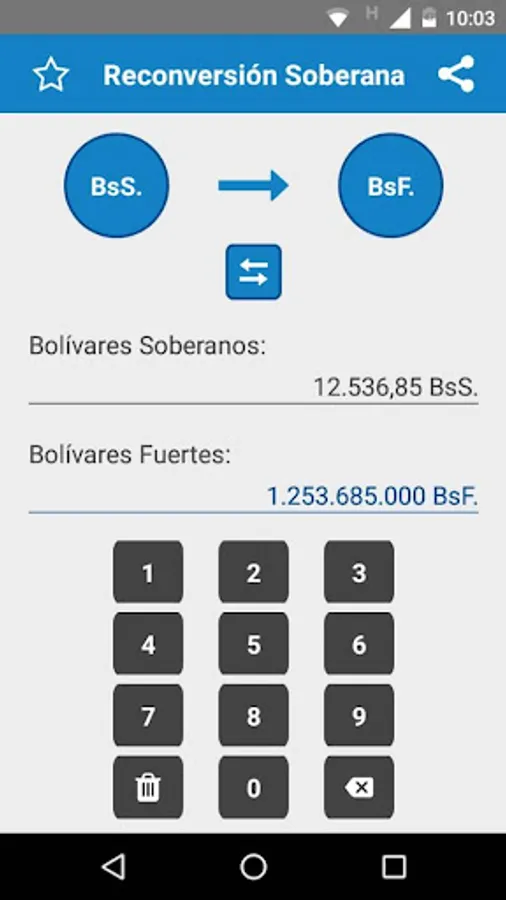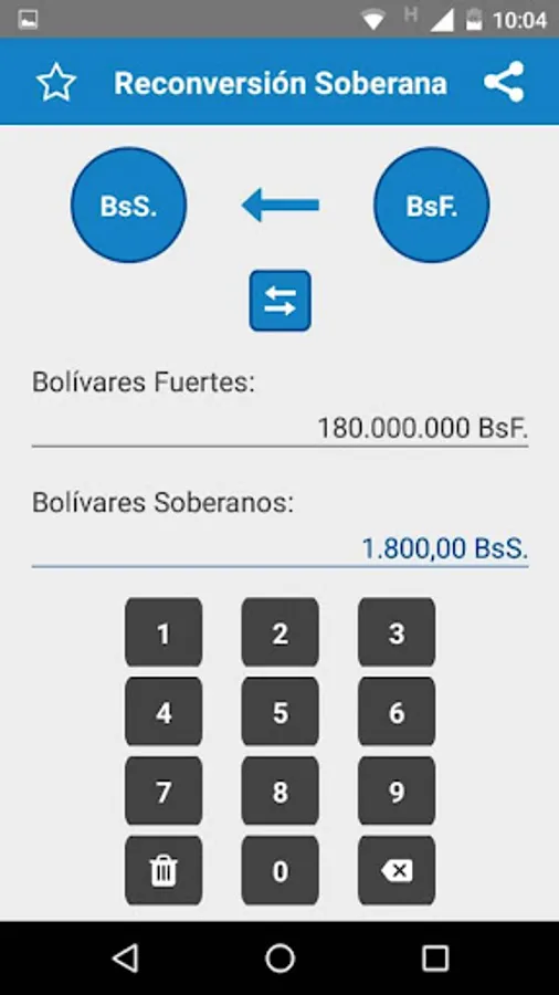 - Possibility of choosing the meaning of the conversion (Sovereign Bolivars to Bolivares fuertes or Bolívares Fuertes to Bolívares Soberanos).
