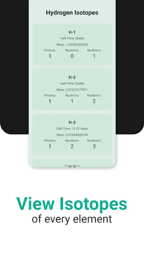 ‘Atomic – Periodic Table’ is an open-source app, designed to be intuitive, which means that the app works great for both those who only wants basic chemistry and physics information like an elements atomic weight to more advanced users who might want more detailed data like an isotope’s halftime or an elements ionization energy. There are multiple tables available in the app as well as some options to easily visualize data with more coming in the near future. 'Atomic - Periodic Table' is a burden-less experience with no ads or other nonsense, just all the data you need for your chemistry or physics project!