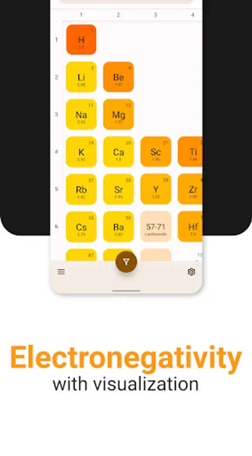 • Electronegativity Table – Easily see the difference of electronegativity between different elements.