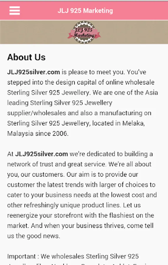 JLJ925silver.com is please to meet you. You’ve stepped into the design capital of online wholesale Sterling Silver 925 Jewellery. We are one of the Asia leading Sterling Silver 925 Jewellery supplier/wholesales and also a manufacturing on Sterling Silver 925 Jewellery, located in Melaka, Malaysia since 2006.