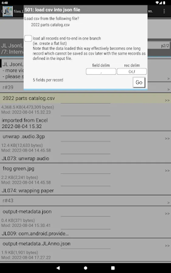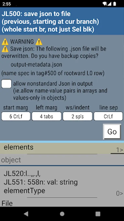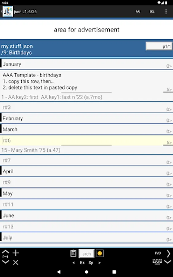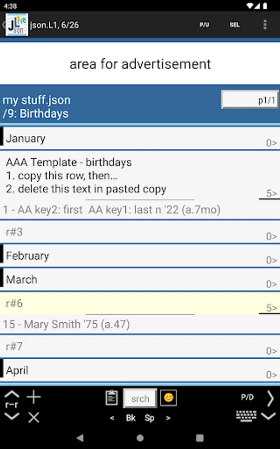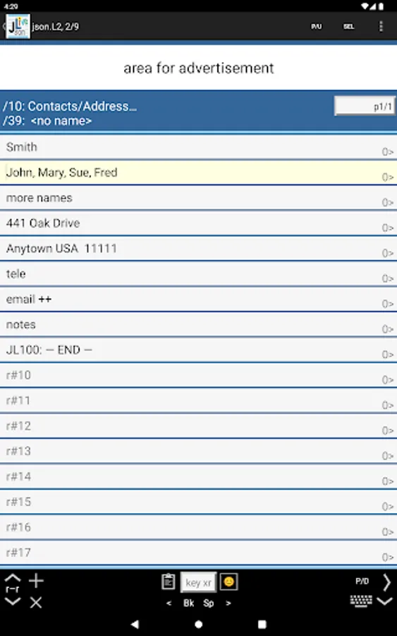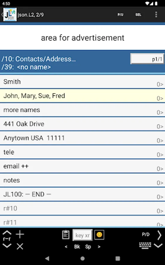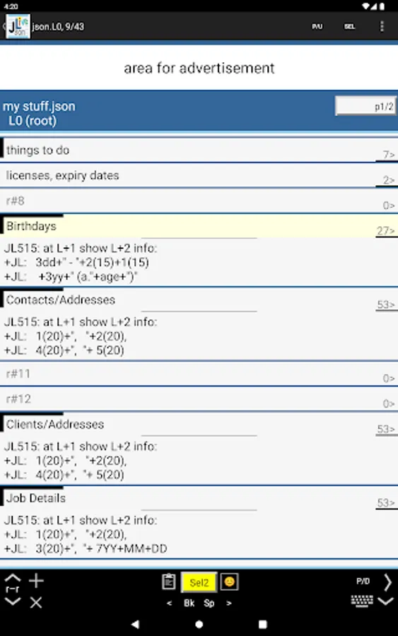 JL is at its core a JSON editor. It can efficiently manage JSON or CSV files up to 30 megabytes or more in size (memory being the limiting factor). In JL you navigate within the tree structure defined by the objects and arrays in your JSON data. There are a wide range of options when loading JSON or CSV data. You can edit the data then save new versions, or save as JSON or CSV (convert the data). Or you can simply use the data in JL. You can create JSON data from scratch. You can create easy-to-read custom reports of two-level information such as birthdays, saved to text files. And JSON, CSV and text report files can be saved with custom margins and indentation.