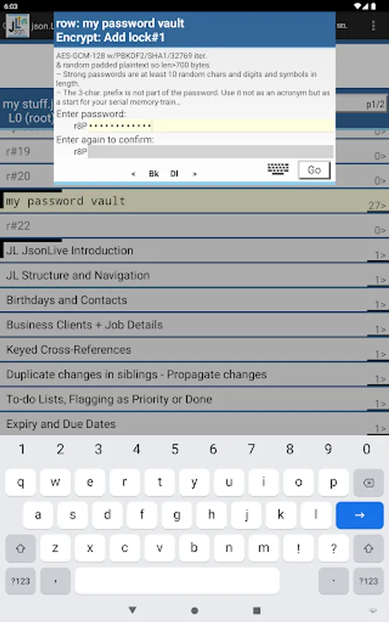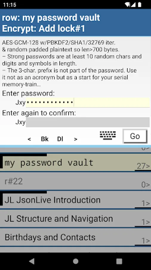 JL offers industry-standard GCM 128-bit password-based encryption for sensitive information such as banking passwords - you can easily create a password manager or vault by encrypting any branch with your master password. You can encrypt information ranging from single rows of text up to large files and folders.
