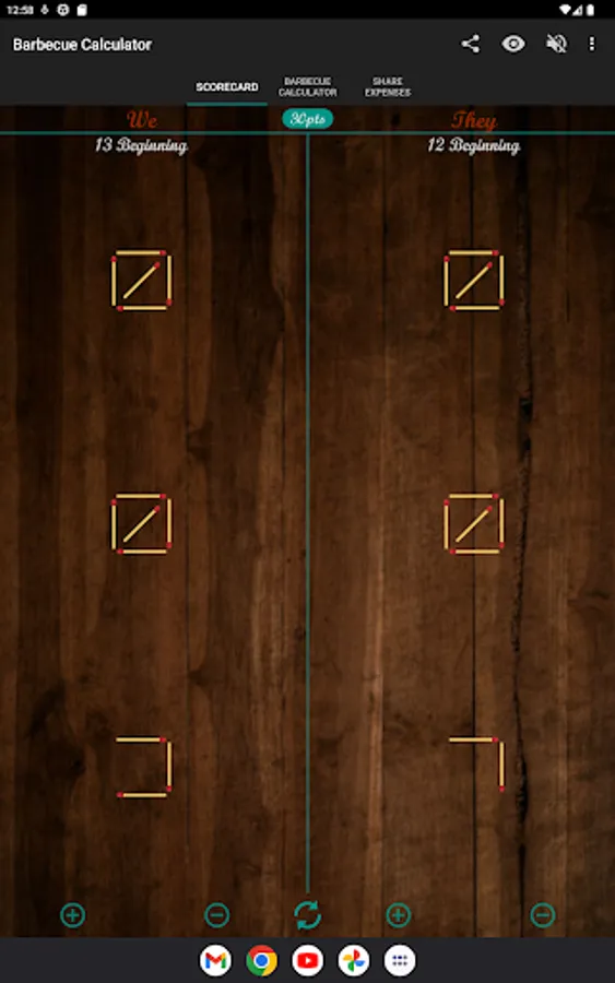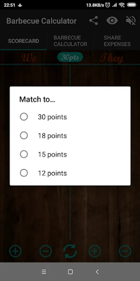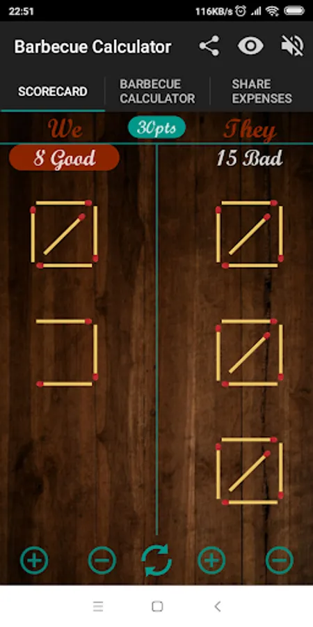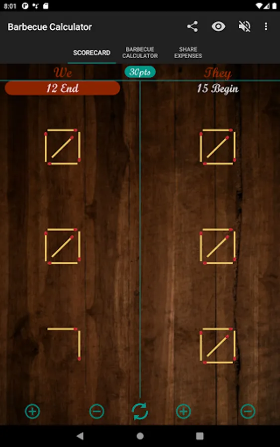 By buttons, you can add or subtract points. Divide the game on two parts of 15 point each. You can send a screenshot by face or other means, showing the result to your contacts. With sounds.