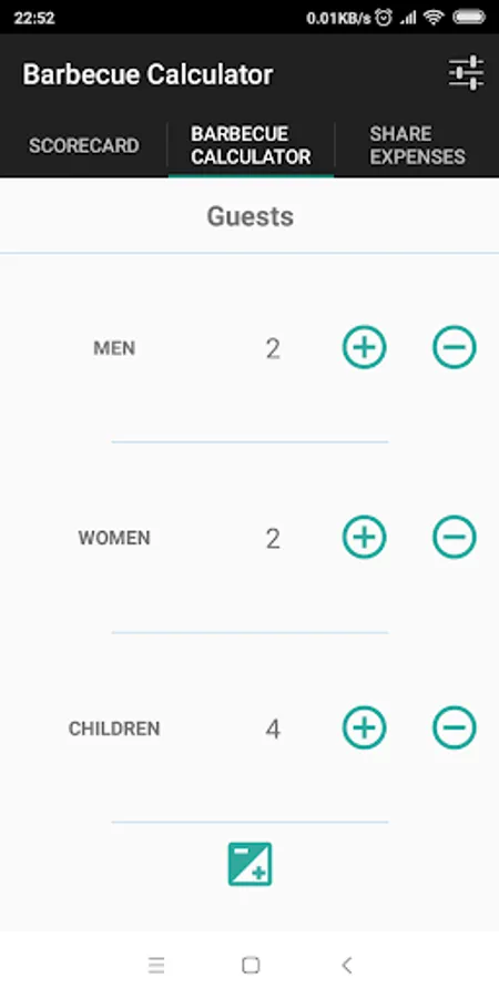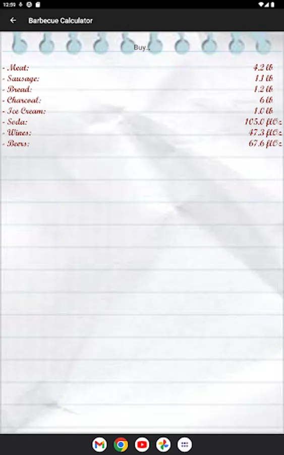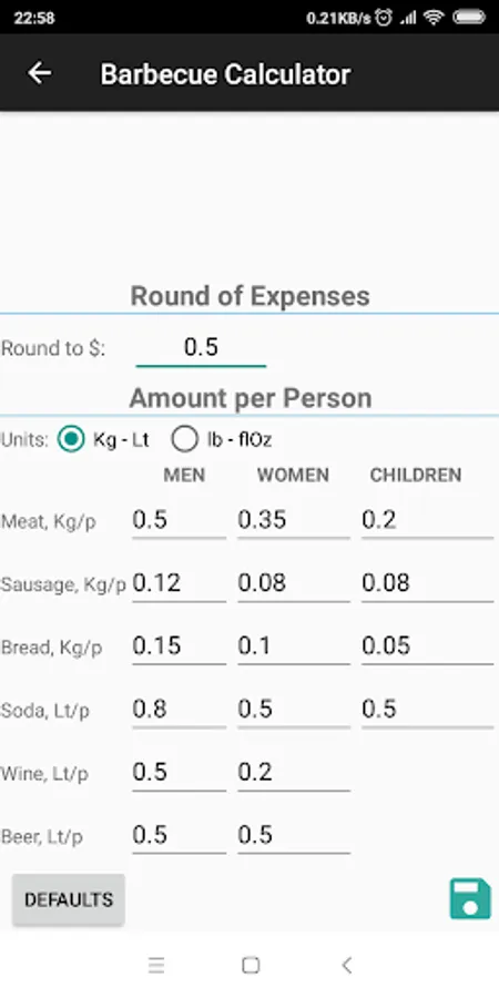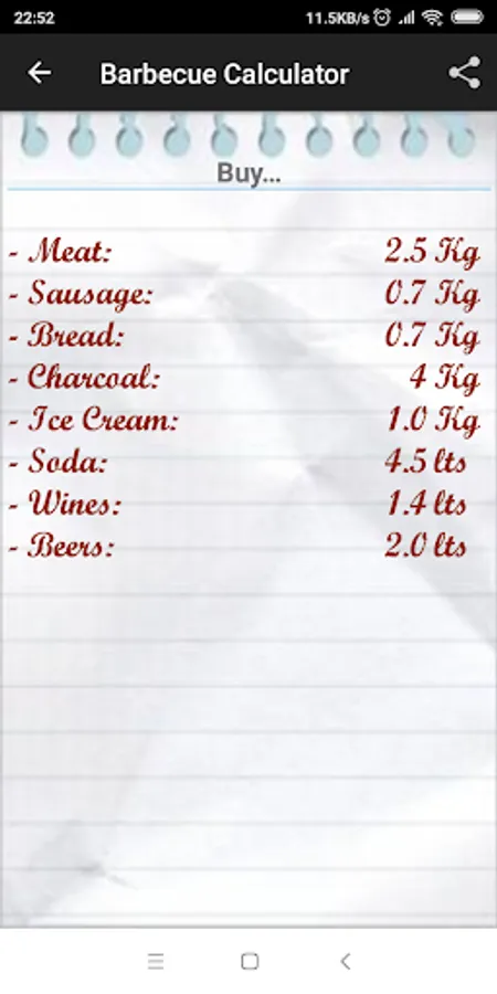 Entering the number of men, women and children who form part of the BBQ, the program will calculate the necessary amount of meat, sausages, bread, coal, drinks, etc. The result may be shared via SMS, face, mail, or other means to persons deemed necessary.