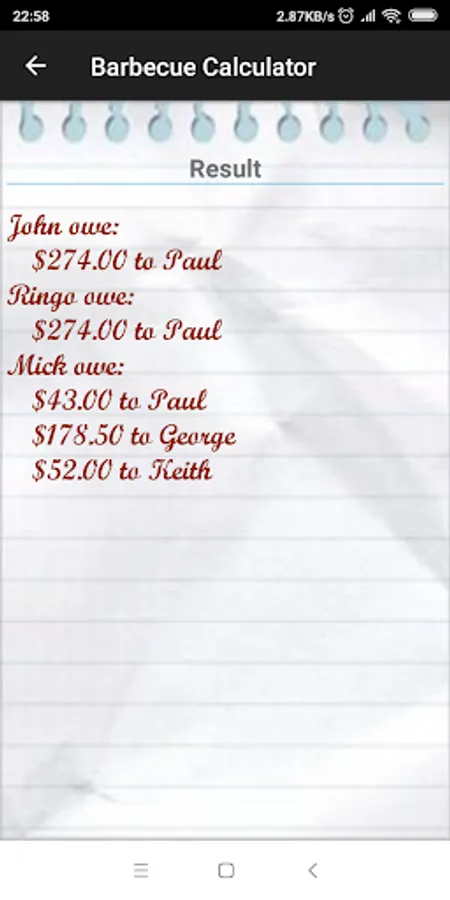 You must enter the persons involved and the costs incurred by them, the program will deliver results indicating who should pay whom. The result can be sent via SMS to each of the involved.
