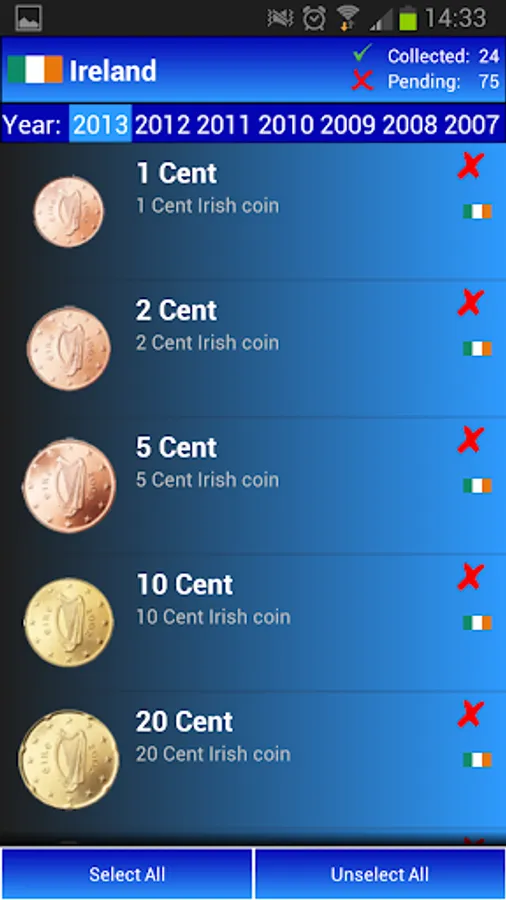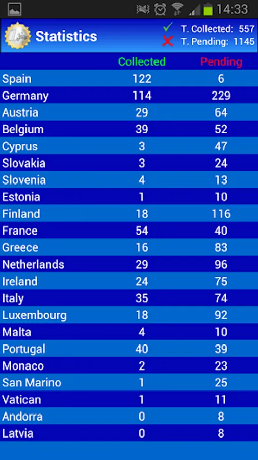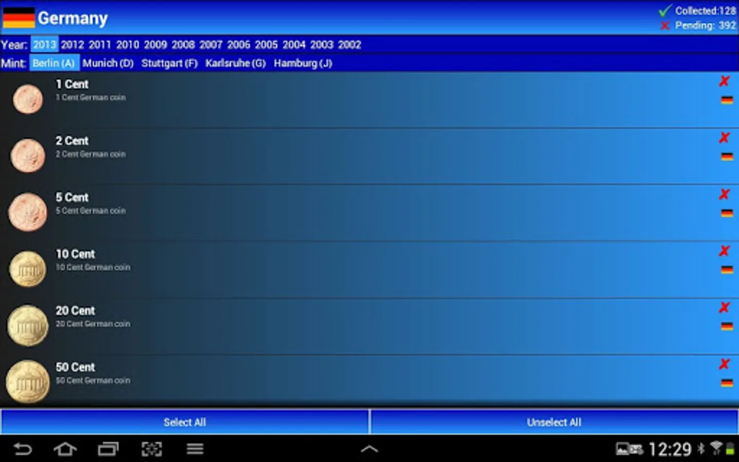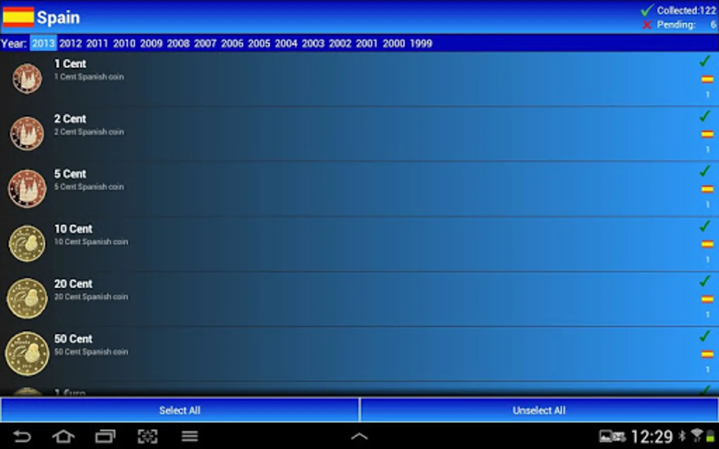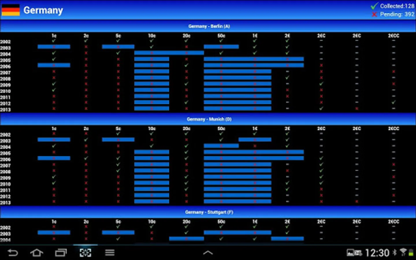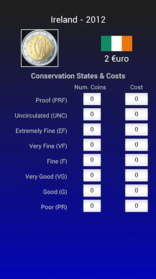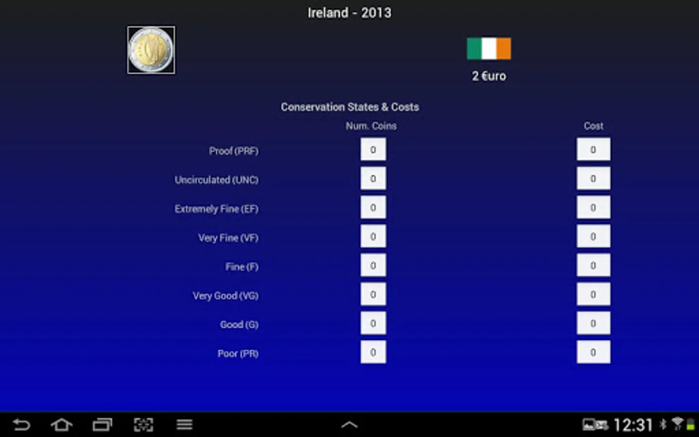 My Euros offer you the posibility of manage your Euro coin collection taking into consideration the differents €uro countries with their years and different mints. In addition, a quick view is included to see a Euro coins resume for a country of your Euro collector.