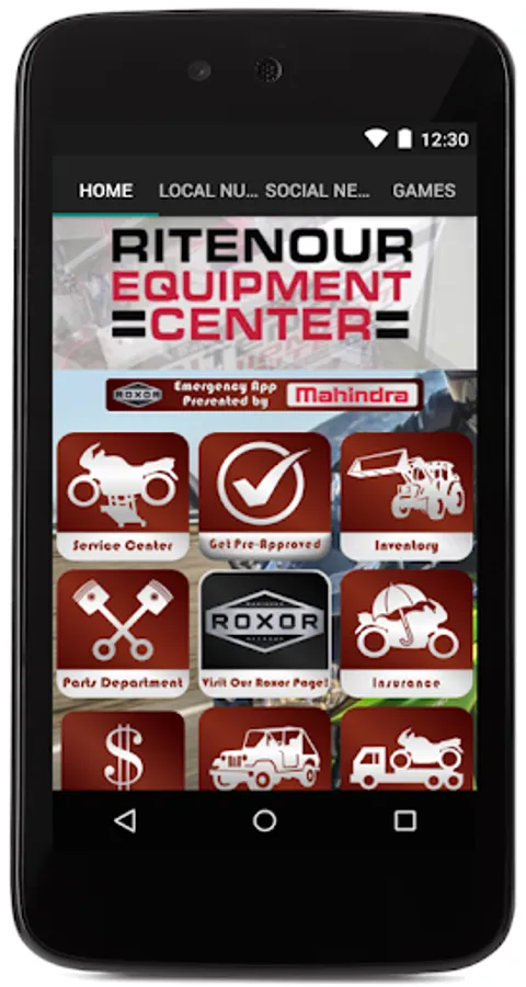 Ritenour Equipment presented by Mahindra Roxor Emergency App. One touch dialing for service and collision repair, locations, Insurance companies, rental cars, towing, locksmith, monthly contest and more. We have even added some games while you wait in the customer lounge. Ritenour Equipment cares about your safety!