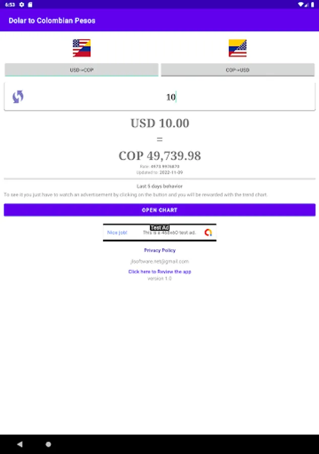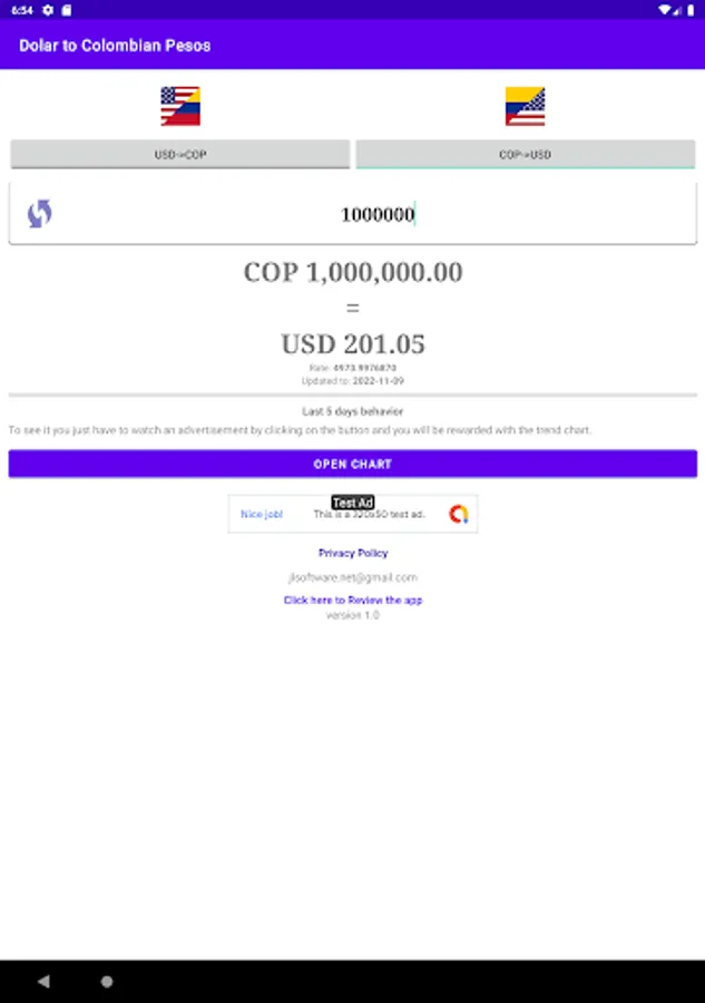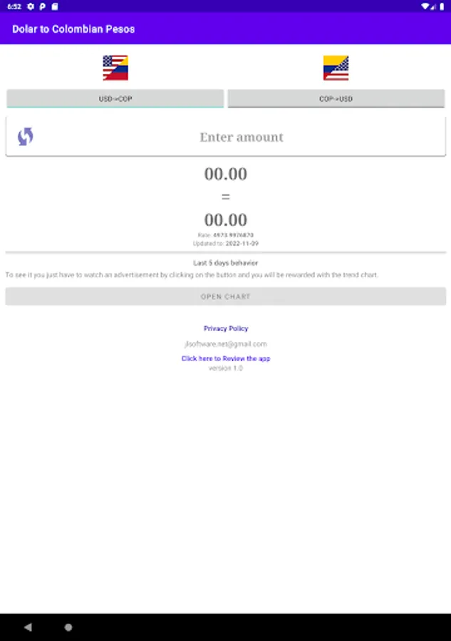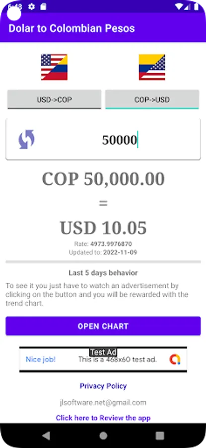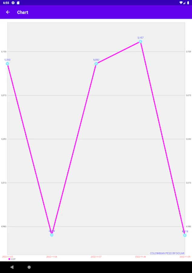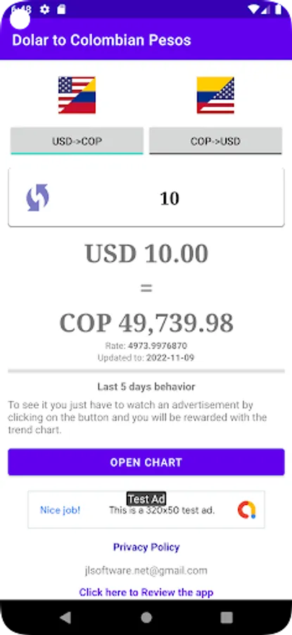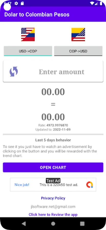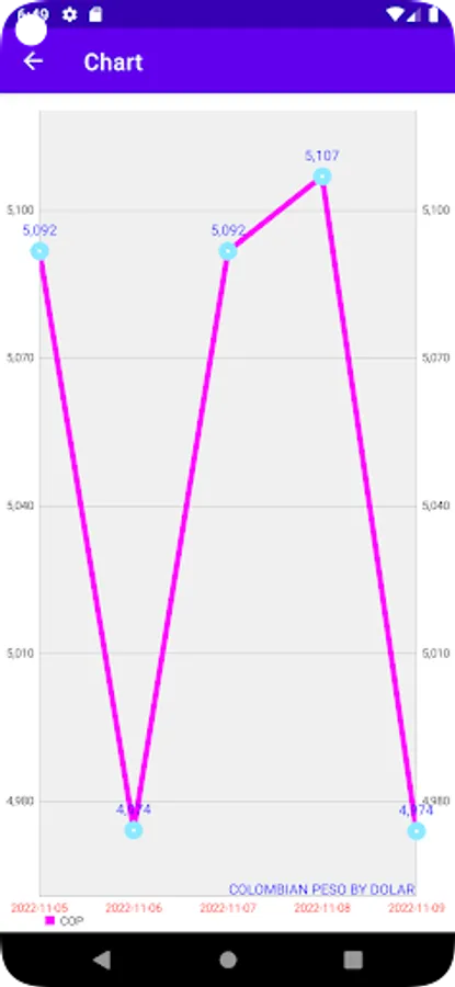 The application allows you to see a 5 day history of the trend of the Colombian Peso versus the Dollar, it is ideal for tourists or for business travel.