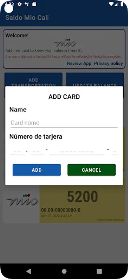 By simply adding the card information, it will be saved only in your cell phone and allows you to check your balance every time you need to know your balance with just one button.