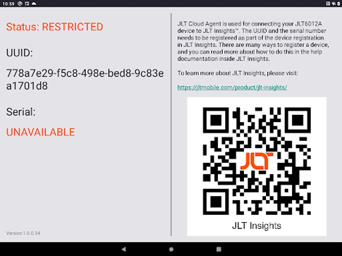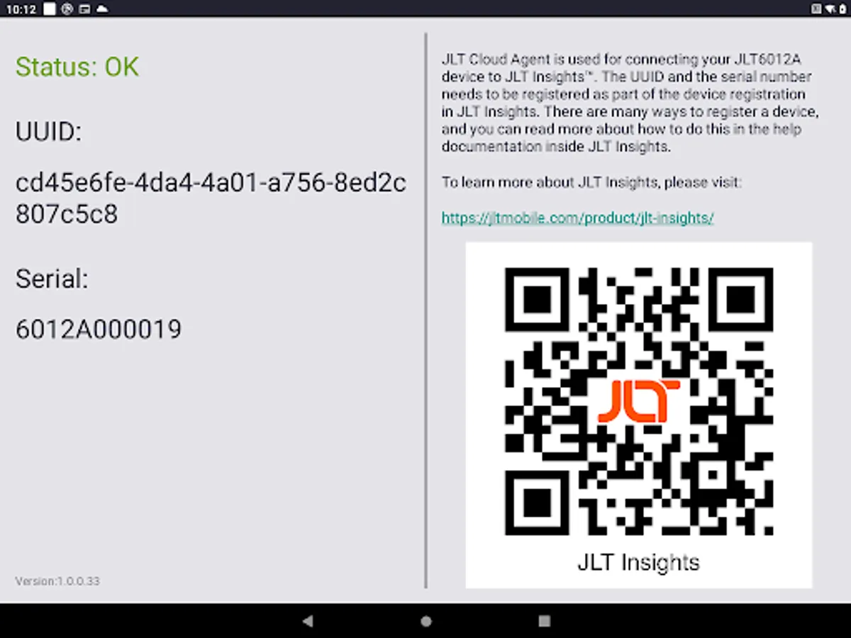 JLT Cloud Agent is used for connecting your JLT6012A device to JLT Insights™. The UUID and the serial number needs to be registered as part of the device registration in JLT Insights. There are many ways to register a device, and you can read more about how to do this in the help documentation inside JLT Insights.