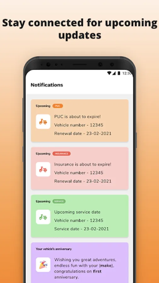 View your vehicle’s insurance details. Get notified on insurance renewal.