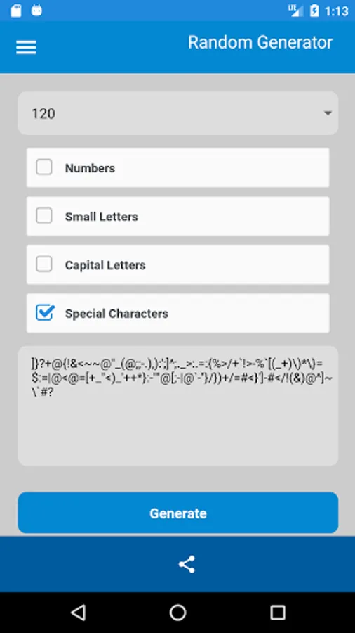 - Random generator to generate any random combination (numbers, small letters, capital letters, special characters).