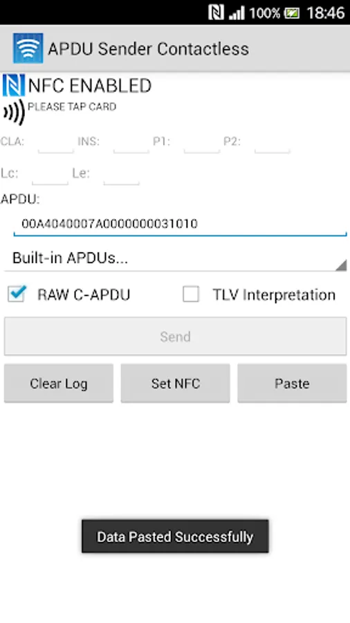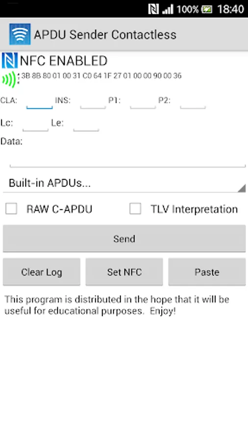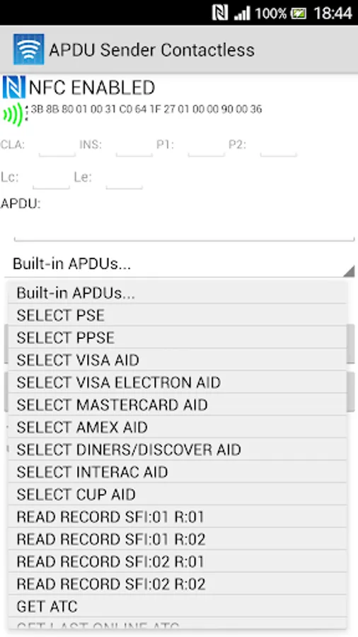 APDU Sender Contactless is an application that allows you to send an ISO7816-4 C-APDU command using wireless technology NFC, and show the card's response.