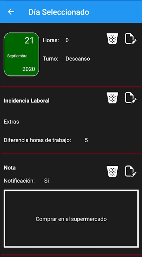 This app also offers the possibility of assigning any work incident that occurs in one day (Overtime, etc.)