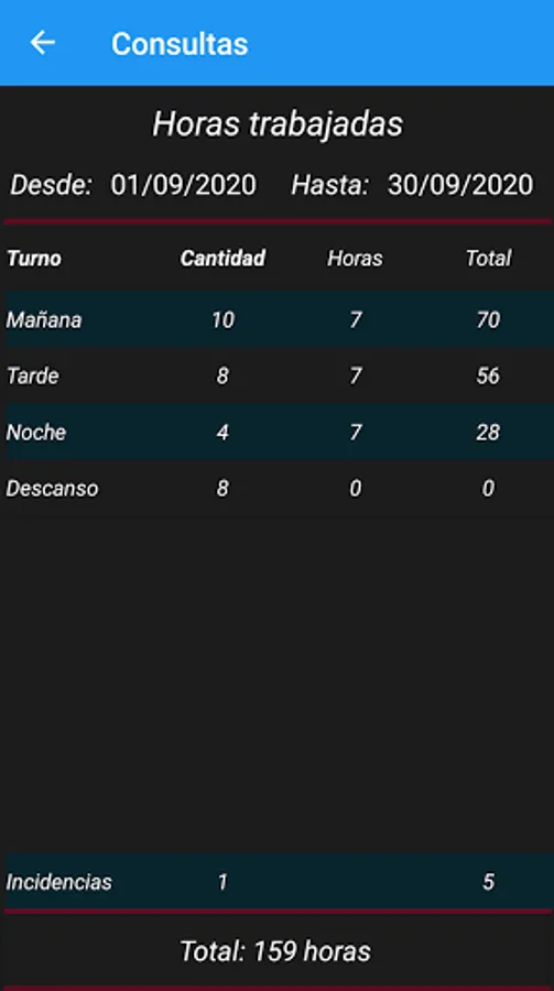 It will show you the total hours worked, between the dates you indicate, in a list grouped by the type of Shift as well as the incidents you have scheduled.