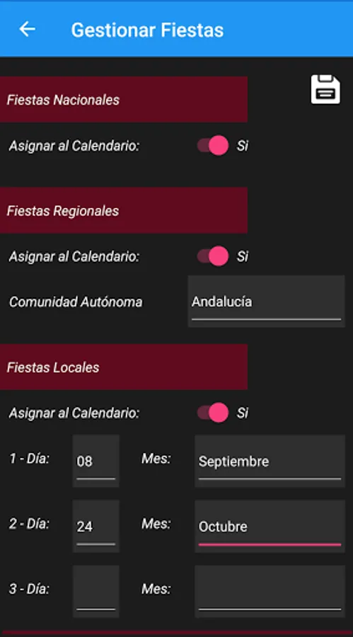 You will have the possibility to assign the National, Regional and Local Holidays to the calendar. To control the number of holidays that you have worked or will have to work.