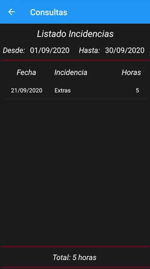 It will show you the total hours worked by incidents, between the dates you indicate, in a list by dates.
