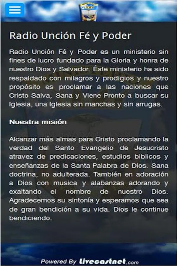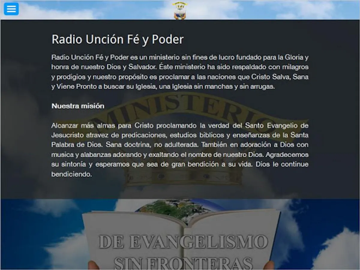 Radio Anointing Faith and Power is a nonprofit ministry founded to the glory and honor of our God and Savior. This ministry has been endorsed by miracles and wonders and our purpose is to proclaim Christ to the nations Salva, Sana and Coming Soon to seek his Church, a Church without spot and wrinkle. Our mission is to reach more souls for Christ proclaiming the truth of the Gospel of Jesus Christ right through preaching, Bible study and teaching of the Holy Word of God. Sound doctrine, unadulterated. Also in worship and praise God with music worshiping and exalting the name of our God. We appreciate your tune and hope it will be a blessing to your life. God continue to bless you.