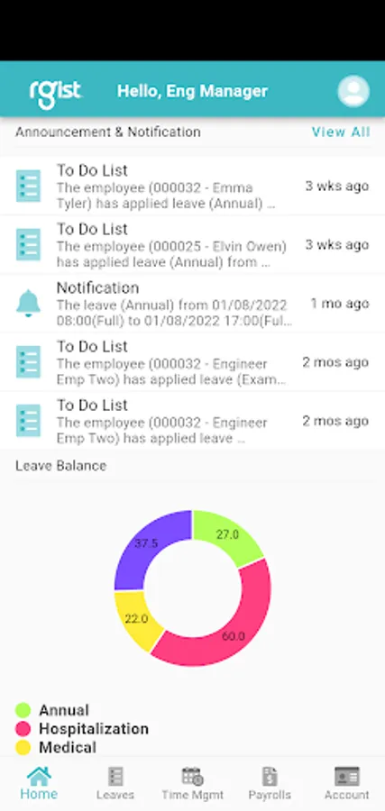 This HR apps with integrated features to HR and company information such as: Time Management System, Payslip, Leave information, Notification and Announcement