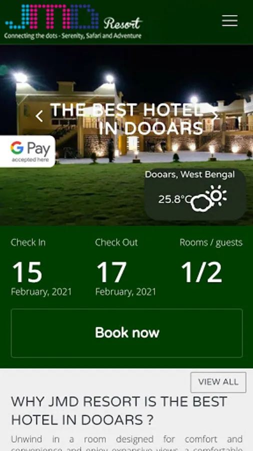 JMD Resort Dooars, a heaven for nature lovers and adventure seeking tourists, is located in Chalsa,dooas on the Chalsa-Lataguri highway just 63 kms from Siliguri amidst tea garden and natural jungle surroundings.One can have the panoramic view of Kanchenjunga Hills while sitting in the balcony of the rooms and cottages of the resort.You can enjoy at its Beautiful Swimming Pool with fountain.