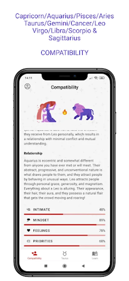 Let us start with just the signs and how they interact based on their qualities. Every sign has an element and a modality. Aries is a fire sign; and its “mode” is cardinal, which initiates. Taurus, the next sign, is ruled by the element of earth; and its “mode” is fixed, which establishes. Certain elements and modes work well and easily together, while others struggle and challenge one another. This app is an excellent tool that maps out zodiac sign compatibility among the signs.