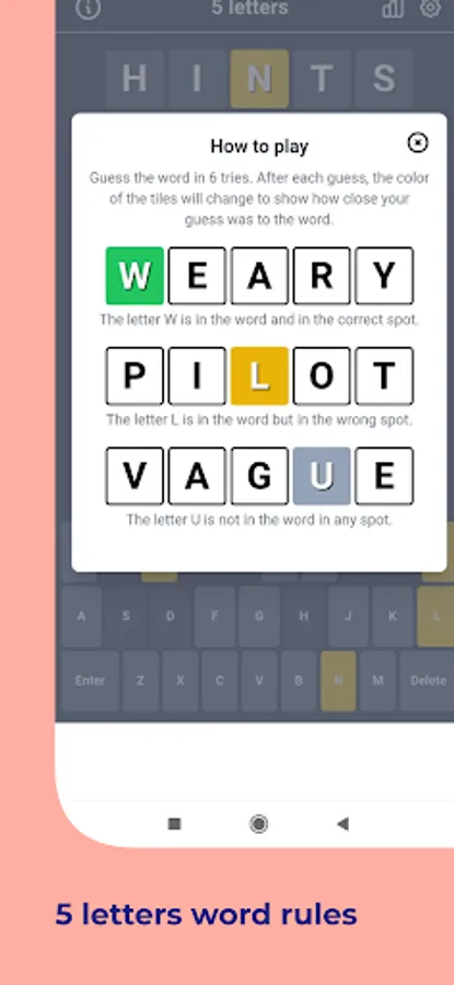 The rules of "word 5 Letters" are very simple: You need to guess the hidden word of 5 letters in 6 tries. To get started, just type any word on the first line.