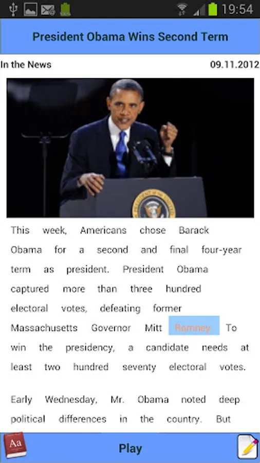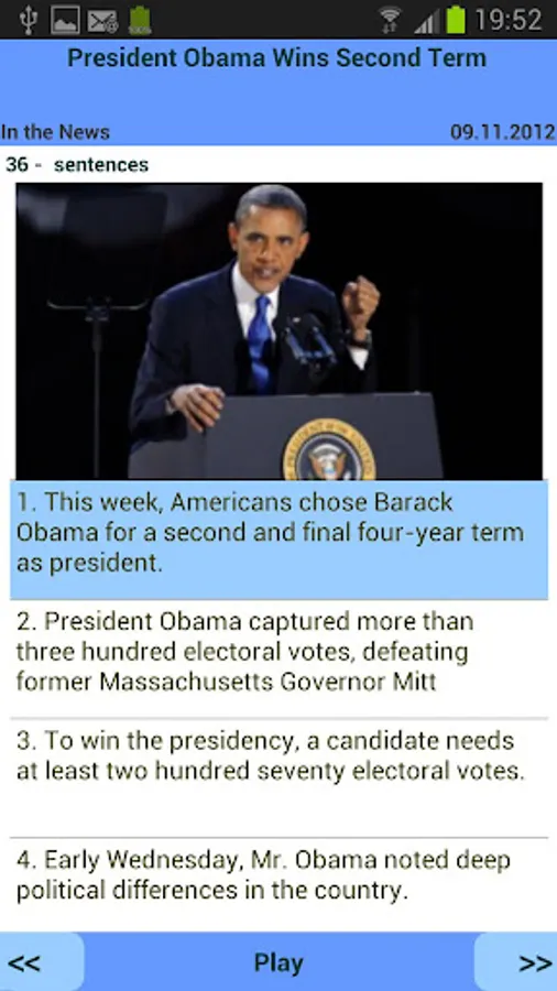 You can select any sentence or word of the lesson to start the listening or to train your English pronouncing. You can repeat any sentence as many times as you like.
