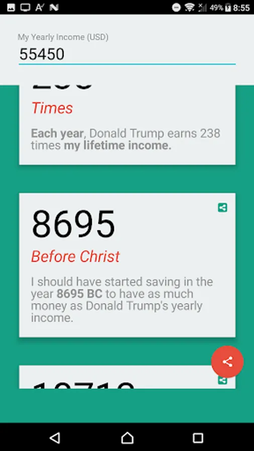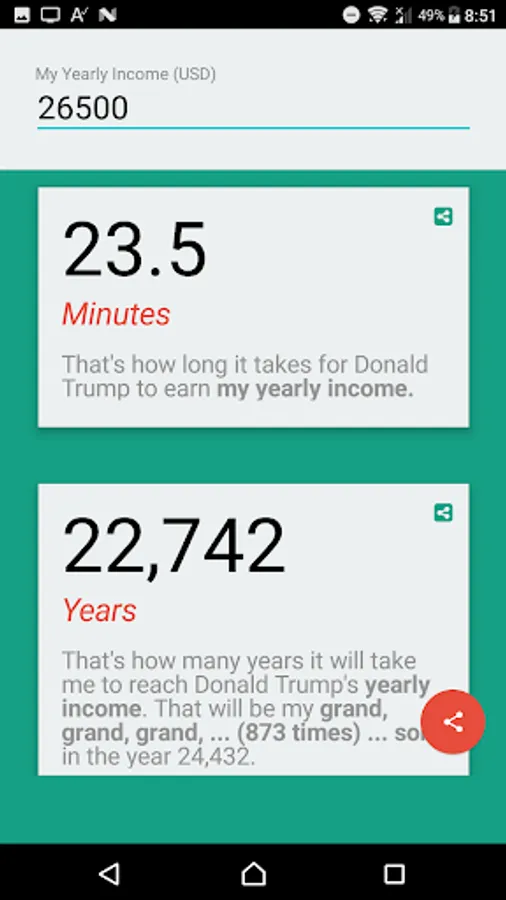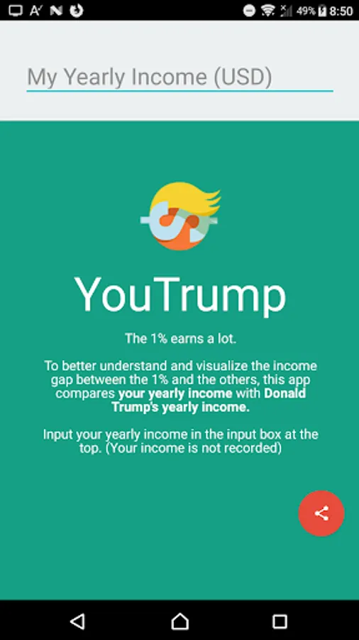 To better understand and visualize the income gap between the 1% and the others, "us", this app compares your yearly income with Donald Trump's yearly income.