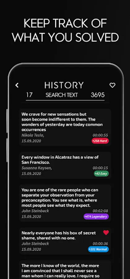 Quotes have the power to change our lives. They can motivate, inspire, encourage, and enlighten us. With Cryptogram, you can not only read some of the most famous quotes in history but also decrypt them to make them more memorable. By solving puzzles, you'll gain a deeper understanding of each quote and be able to remember it more easily. You can keep track of your progress, favorite quotes, and even share them with your friends.