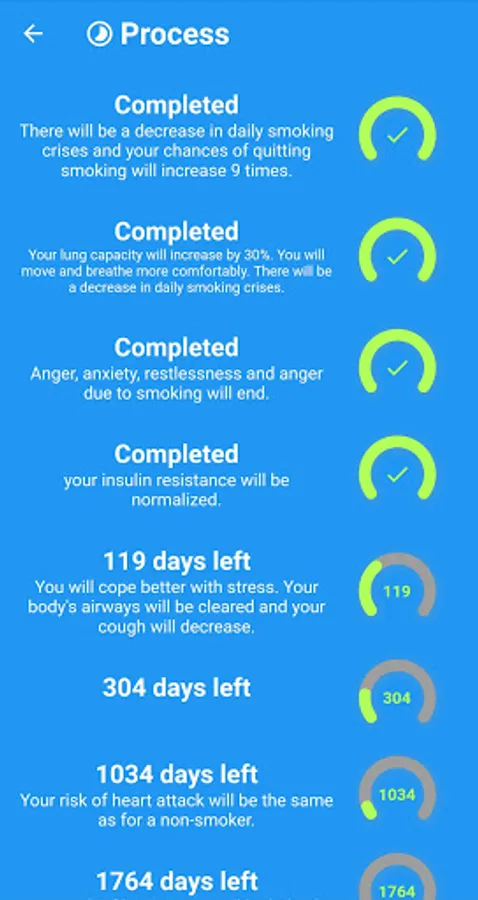 - Countdown timer to watch all aspects of your health improve as a result of your great decision to stop this bad habit of smoking.