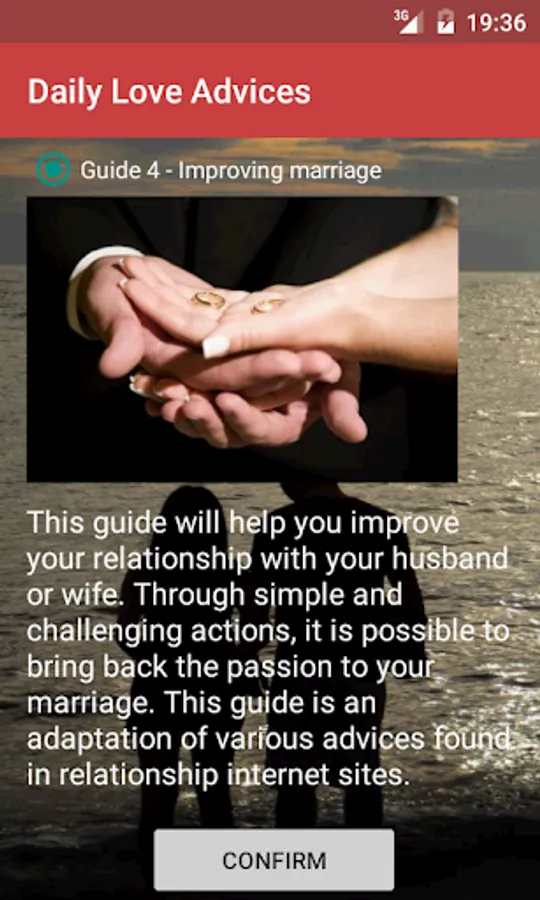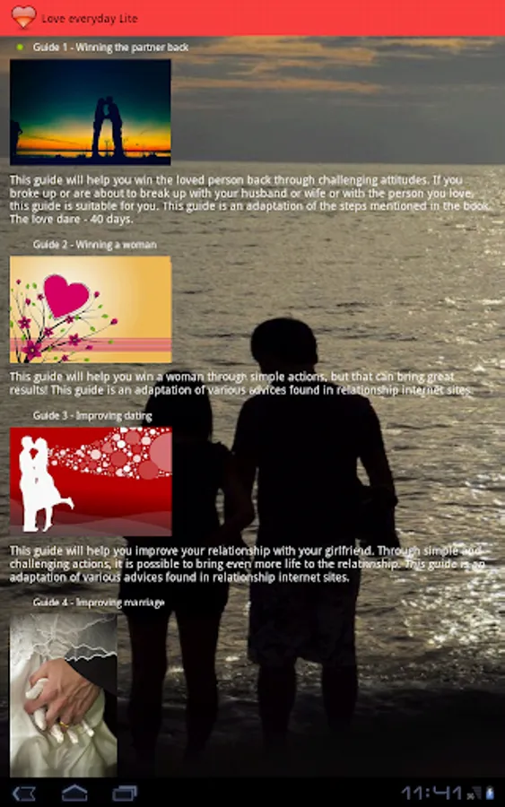 This app will guide you everyday through guides made for winning or winning the loved one back. Different guides can be chosen, depending on your objectives.