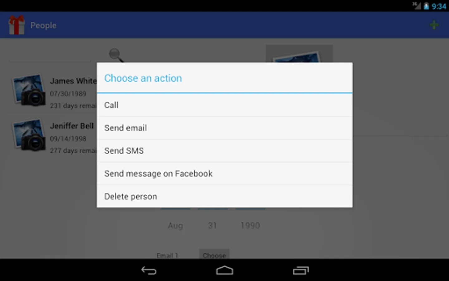 Call, send SMS messages or emails directly from Happy Birthday! Simple and fast, Happy Birthday will never let you down! No more embarrassment! Let this application remembers you the dates! Download now and for free!