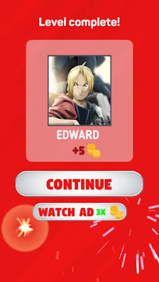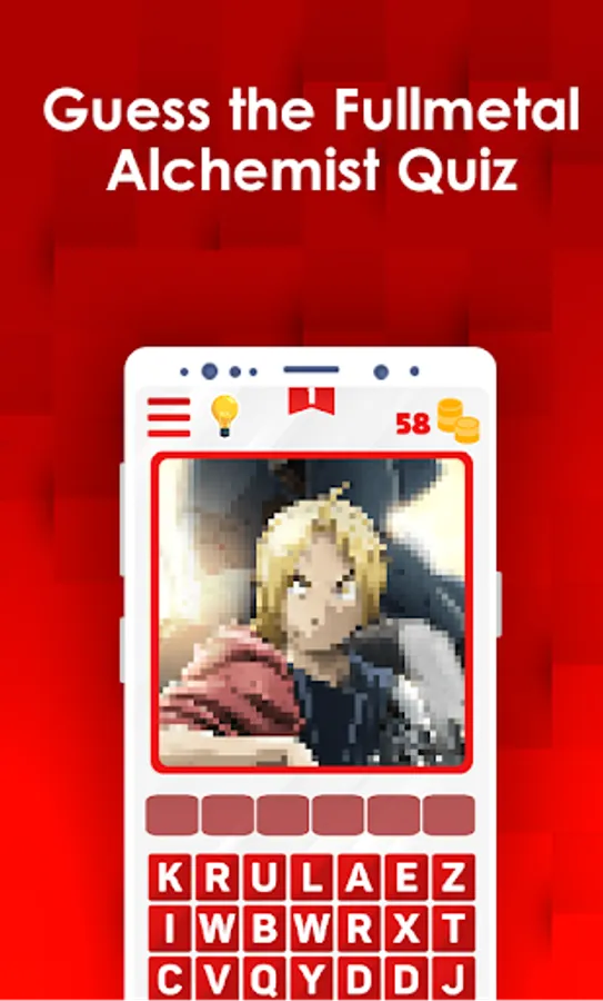Very easy, touch the picture to get more crear the image and you just have to select the correct letters to complete the name of the Fullmetal Alchemist character that appears on the screen and once you have passed the level you will receive a bonus with which you can obtain hints in the next levels.