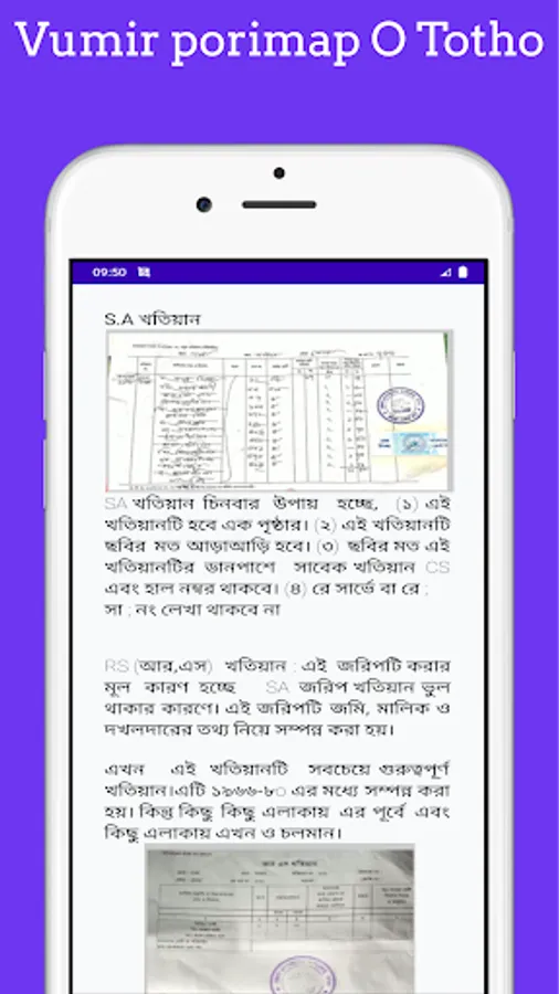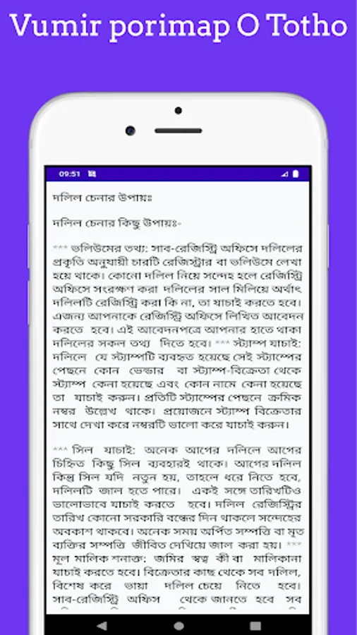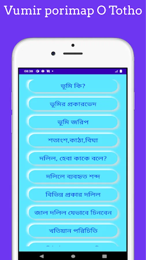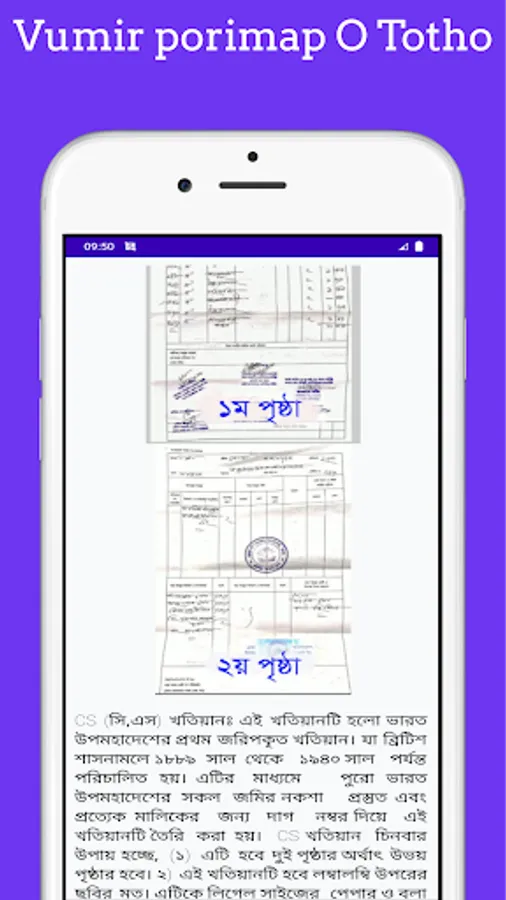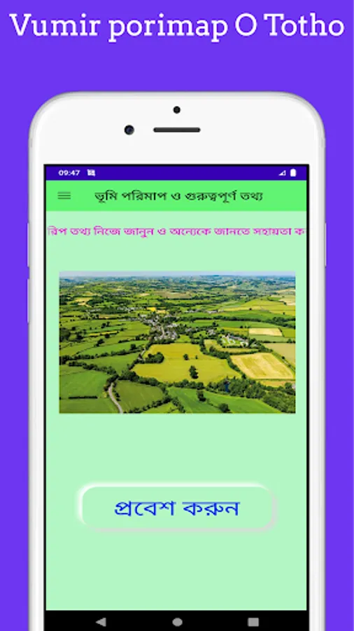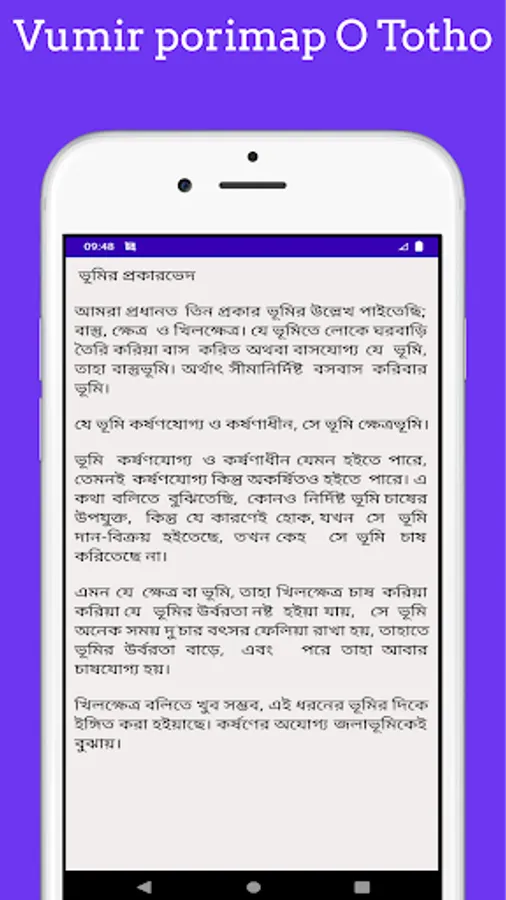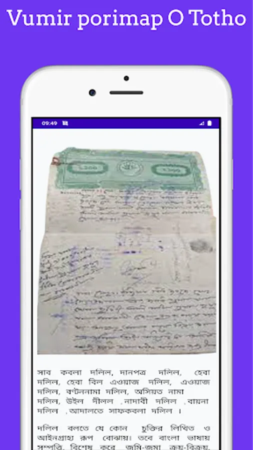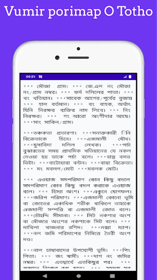 In this app we have explained what is land, types of land, size of land, different types of documents, original documents and fake documents etc. Moreover, regional measurements (jomir map-Kara, Katha, Kani, Bigha etc.) and international measurements-percentage, acre have been discussed. In terms of land size, the traditional Ana, Ganda, Kara, Kranti have been discussed.