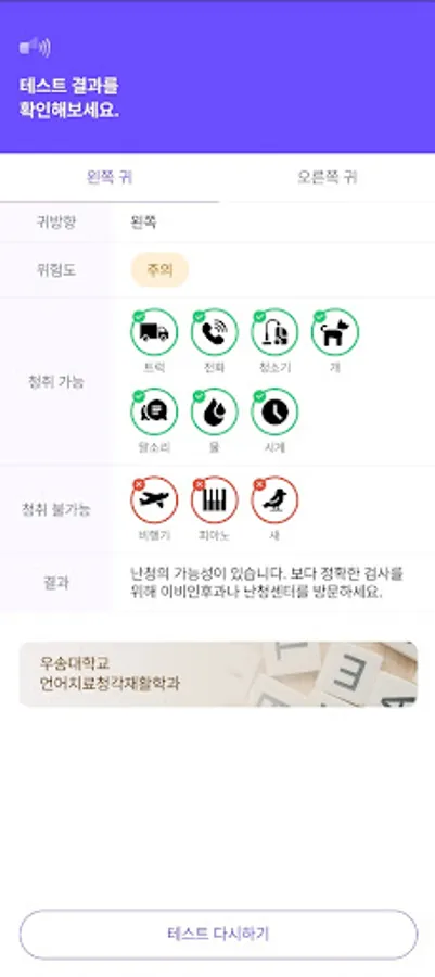 It is a hearing test application using environmental sounds for those who are curious about their hearing.
