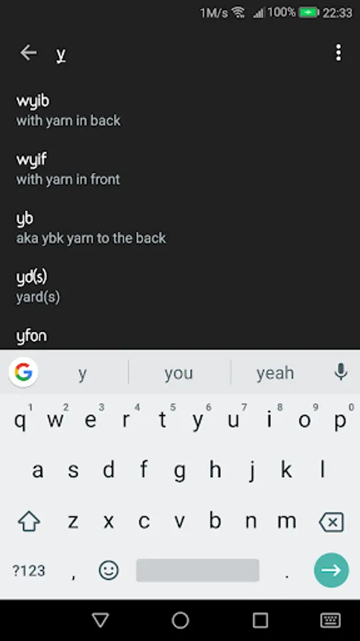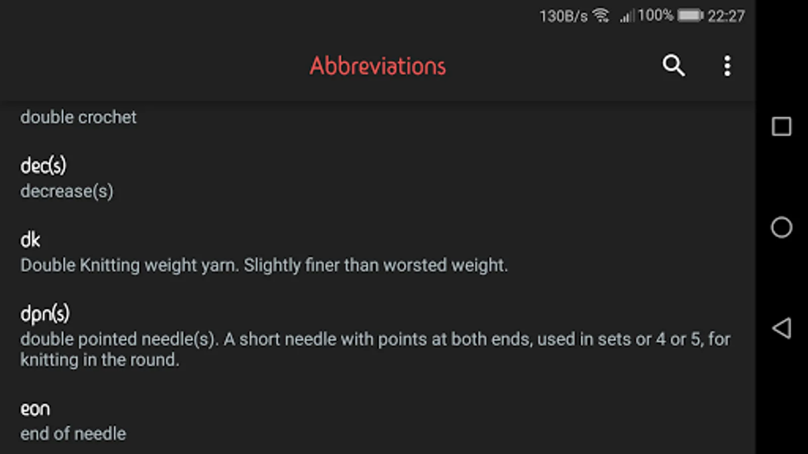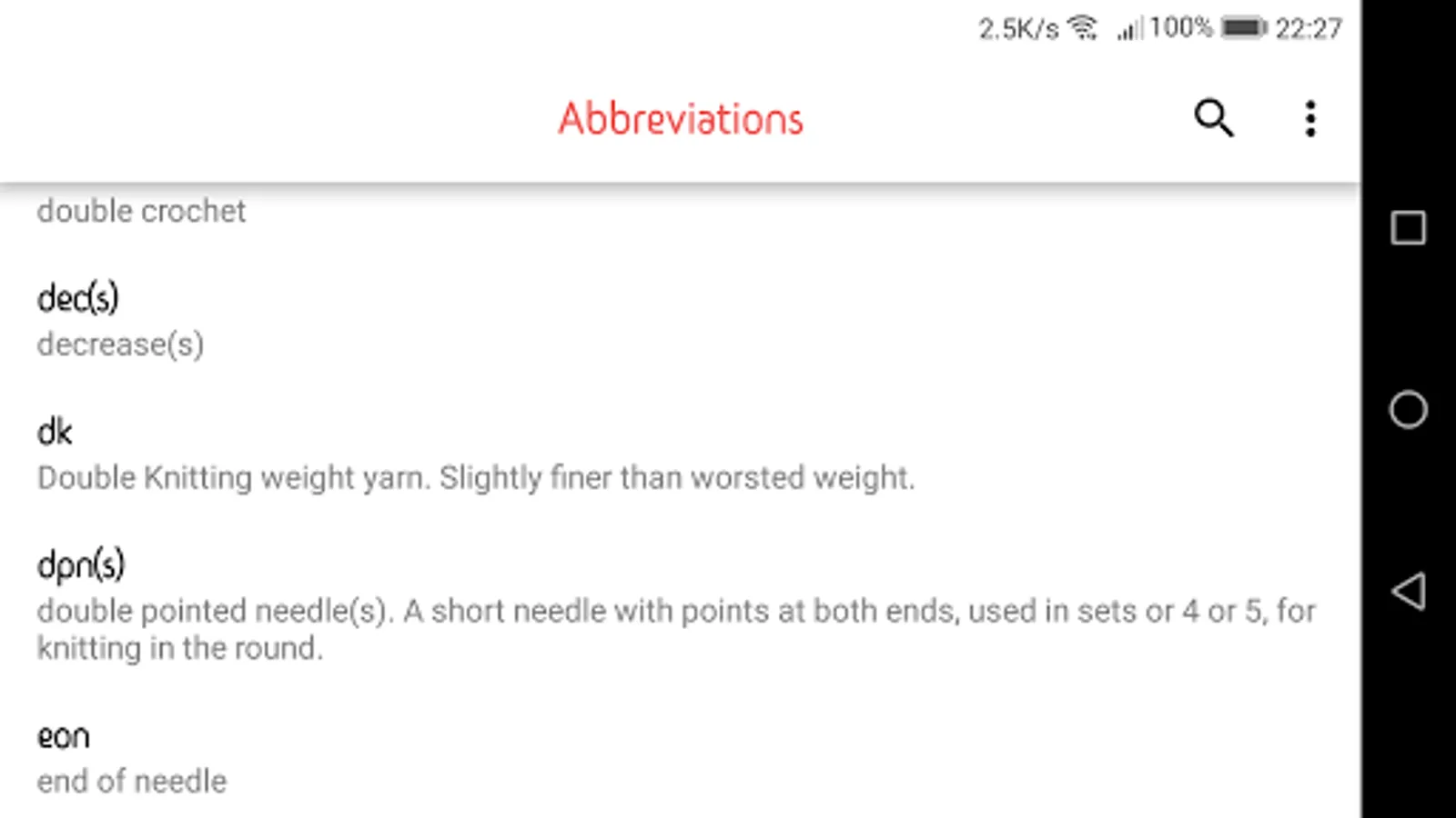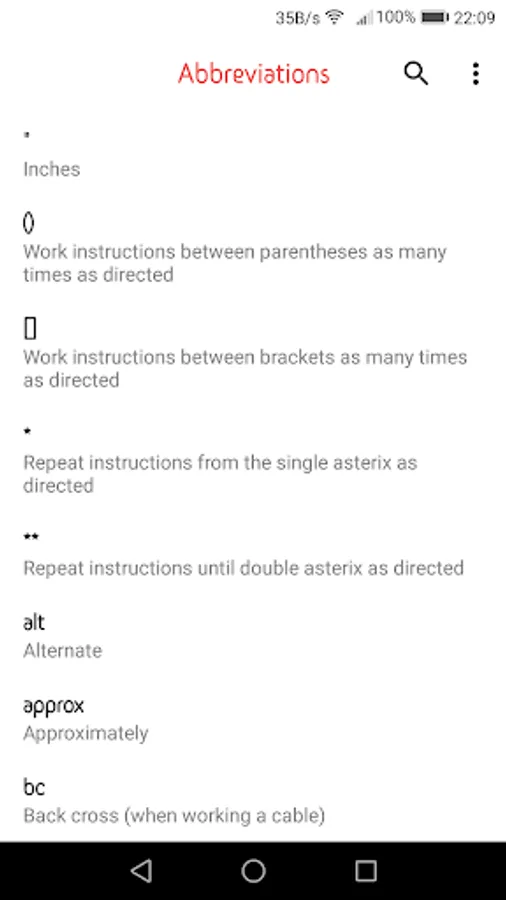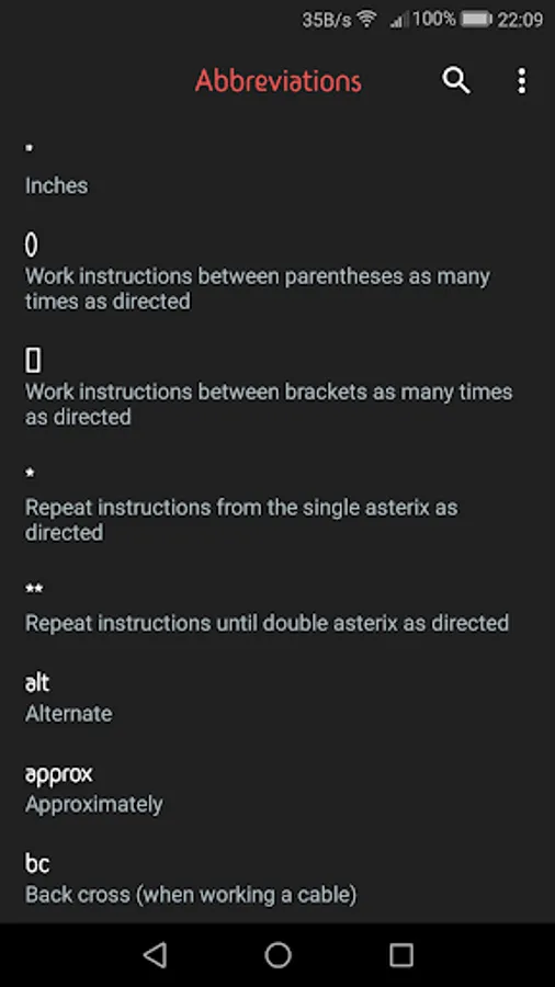 This app has a large list of abbreviations that are used in knitting patterns.