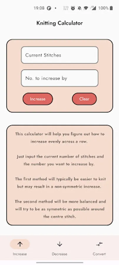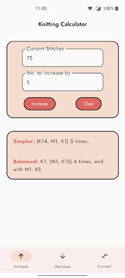 Simply input the number of current stitches and the number of stitches you want to increase or decrease by and the calculator will give you two methods you can choose from. The first method is typically easier to knit but the second gives you a more balanced increase or decrease.