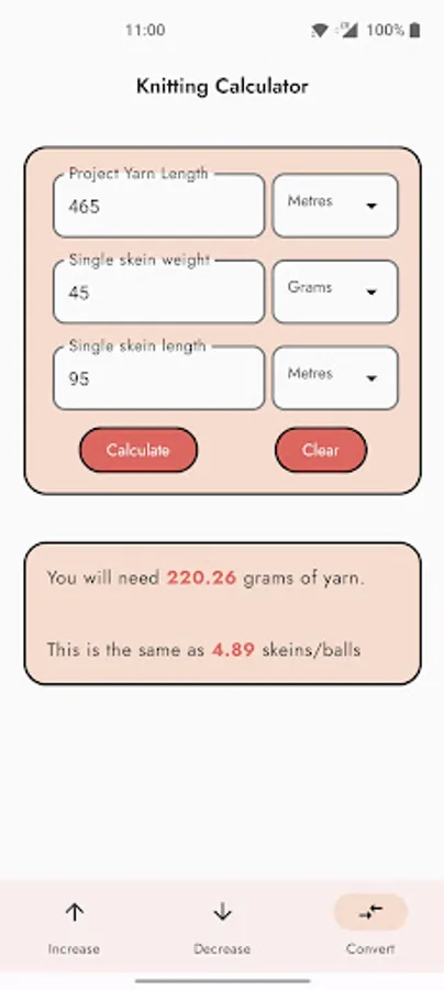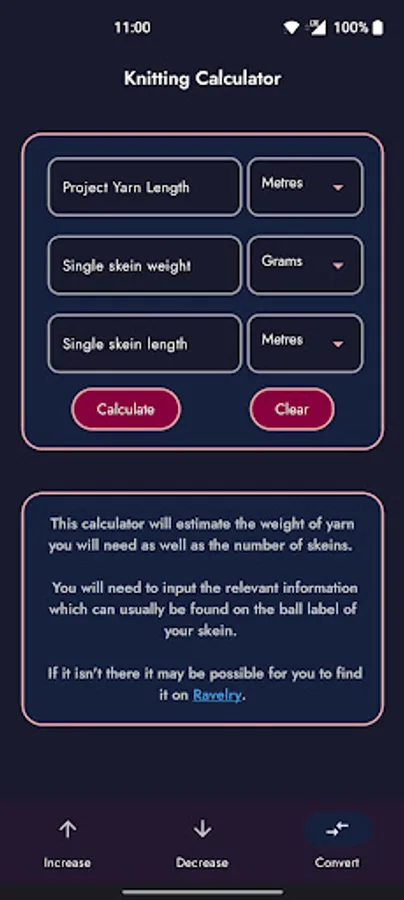 The calculator can calculate how much yarn you will need for a pattern and how many skeins/balls that will be, based on your pattern requirements. Various units are supported (yard, metres, grams, ounces).
